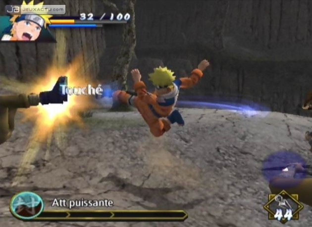 Dans la peau de Naruto, l’objectif ici sera d’enchaîner plusieurs missions de divers rang (A, B, C, D et S) imposées par le Hokage, le chef du village, comme c’est souvent le cas dans le manga. Notre héros évolue sur une carte où il peut se rendre à des points bien précis. Aider une jeune femme à faire la pub de son magasin pour empêcher la faillite, éliminer des espions qui rôdent autour des portes de Konoha ou bien encore se rendre à un autre village pour porter secours aux plus démunis, quelque soit la mission, elle aboutit systématiquement à une séance de combat. Concernant la palette de coups, si elle apparaît de prime abord conséquente, on se rend rapidement compte qu’on en fait le tour très rapidement. Multi-clonage, lancers de kunais ou de shurikens et autres Rasengan, voilà à peu près les techniques possibles de Naruto. Les combos sont bien d’actualité mais leur manque de variété aboutit à un système de combat finalement assez répétitif, et ce malgré la présence d’une boutique où il est possible d’acheter des armes supplémentaires. Bien évidemment, la zone d’exploration au départ est restreinte et c’est en avançant dans le jeu que Naruto peut accéder à d’autres lieux connus de la série. Seulement voilà, durant ses balades sur la carte, Naruto sera sujet à des assauts aléatoires, à l’ancienne, comme dans un vieux Final Fantasy. Pas la meilleure idée d’autant que ces attaques "inattendues" ont généralement lieu aux mêmes endroits. Bref, pour l’effet de surprise on repassera.