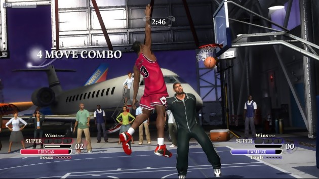 Oui, il est possible de claquer des dunks de quarante mètres de hauteur dans NBA Ballers : Chosen One, pour peu que l'on n'ait pas le vertige. Mais avant de défier les lois de la physique sur le bitume, on constate que les modes de jeu se comptent sur les doigts d'une main. Le mode "Story", qui est censé représenter l'essentiel du titre avec pas moins de six épisodes divisés chacun en cinq chapitres, se révèle assez quelconque, même si la possibilité de sculpter son propre avatar a toujours du charme. Si on s'est interdit de comparer NBA Ballers : Chosen One et NBA 2K8, il faut par contre admettre que Midway manque cruellement d'imagination en termes de création ; bien que des paramètres supplémentaires s'ajoutent au fur et à mesure que l'on progresse dans le jeu. Disons que le minimum syndical a été assuré, puisque l'on pourra répartir selon ses propres goûts des points d'expérience - ou de compétence - pour tailler son élève à son image. Si l'on préfère les meneurs véloces et percutants - Manu Ginobili, Tony Parker - au sein de la rédaction, on peut tout aussi bien créer un ailier féroce dans la raquette, ou bien encore un pivot prêt à croquer les doigts de celui qui s'approche de son panier. Naturellement, le profil du joueur évolue au fil des rencontres tout au long de son parcours professionnel, ce qui prétexte la présence d'un certain nombre de défis à relever, que ce soit en 1 vs. 1, ou 2 vs. 2. Exécuter un mouvement particulier, marquer un nombre de points précis, recoller au score avec un handicap plus ou moins important. Si ces pseudo-missions s'avèrent intéressantes au départ, elles deviennent rapidement rébarbatives par la suite, la faute à un manque cruel de variété dans le contenu, ce qui est fatal dans ce type d'exercice. Le mode Story, c'est aussi l'occasion de croiser la route de certaines gloires qui squattent actuellement les parquets de la NBA. Tim Duncan, Tony Parker, Lebron James, Kobe Bryant, Dwight Howard, tous sont au rendez-vous. Pour les fins limiers du basket-ball américain, quelques légendes sont également présentes dans NBA Ballers : Chosen One, comme Larry Bird qui a marqué de son empreinte les Celtics de Boston. Un mode Online, dans lequel on peut reprendre son propre avatar, est disponible, avec la possibilité d'organiser des matches officiel pour améliorer son classement, et espérer devenir l'Elu du streetball. En attendant, il va falloir s'habituer aux commandes de NBA Ballers : Chosen One qui, on le concède, ne facilitent pas la prise en main. Plus concrètement, il s'agit de réaliser des combinaisons complexes aussi bien avec les boutons de façade que de tranche, que l'on soit en phase offensive ou défensive. En pressant LB et X, on actionne un quick time event aussi intolérent que Mademoiselle Mangin. Plus sérieusement, la moindre hésitation - même de quelques millisecondes - annule la séquence, ce qui frustre plus qu'autre chose. Si l'opération réussit, on parvient à chiper le ballon à l'adversaire ou bien alors à claquer un dunk au-dessus de sa tête. Pour finir sur une note artistique, avouons que NBA Ballers : Chosen One est loin d'être moche, et ne ralentit même pas. Les terrains de jeu nous font découvrir des endroits tantôt atypiques, tantôt exotiques pour une partie de basket-ball, ce qui permet de se détacher le temps de quelques heures du sérieux de la NBA.