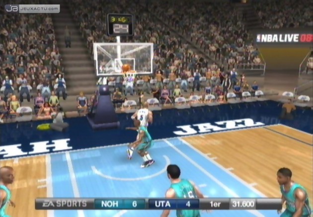 L’injustice sévit dans tous les milieux, même dans le jeu - spécialement dans le jeu vidéo - et la sortie de NBA Live 08 sur Wii en est une preuve flagrante. Alors que nous nous réjouissons des efforts apportées dans cette nouvelle édition sur l’ensemble des autres supports sur lesquels le jeu est paru, Electronic Arts plombe l’ambiance en nous offrant certainement la plus mauvaise adaptation de la série jamais faite jusqu’à présent. Visuellement pour commencer, nous avons fait un bond en arrière de plus de 7 ans avec des graphismes d’une laideur et d’une simplicité à nous filer des frissons dans le dos. Les textures sont grossières, les visages sont vides de toute expression et le public dans le décor fait davantage office de papier peint que d’un véritable décor. Pire, les animations sont tellement figées que nous avons le sentiment de prendre le contrôle de robots mal huilées. Le constat est aussi désespérant en ce qui concerne le gameplay et la jouabilité. Si les autres moutures du jeu proposaient un style de jeu à mi-chemin entre arcade et simulation, NBA Live 08 prône une toute autre attitude, celle du grand n’importe quoi. L’intelligence artificielle est tellement à la ramasse que le terrain ressemble davantage à une cour de récréation que d’un véritable lieu de rencontre. Quel que soit le côté choisi, les joueurs se déplacent de façon totalement incohérente, si bien qu’il est quasiment impossible de penser à une quelconque stratégie de jeu. Le genre de choses impensables quand on sait que NBA Live 08 propose une jouabilité pensée spécialement pour la Wii et son public plus indulgent.