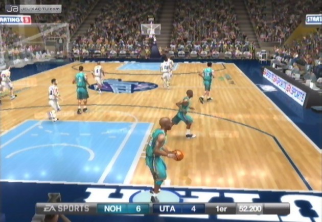 A l’instar de Table Tennis, le titre d’Electronic Arts propose deux types de configurations. La première appelée Commandes familiales se joue uniquement avec la Wiimote et consiste à se focaliser sur son jeu, à savoir les passes, les dribbles, les dunks et tout le reste des mouvements. Pour les déplacements, c’est l’ordinateur qui est maître de décision et il ne tient donc qu’à nous de composer avec ce qu’il a envie de faire. Si les passes se réalisent en appuyant sur la touche A, les mouvements de type dunk et autre lay-up se font en bougeant la Wiimote, soit du haut vers le bas, ou soit de la gauche vers la droite. Rien de plus complique sur le papier certes, mais le résultat à l’écran est d’un tout autre acabit, surtout quand on sait qu’il existe deux petites secondes de latence entre le geste du joueur et ce qui se passe à l’écran. C’est pourquoi, il est chaudement recommandé de choisir le type de commandes avancées, où l’entrée du Nunchuk permet de contrôler ses joueurs. C’est peut-être plus naturel mais ce n’est encore pas la bonne méthode pour que la Wii puisse enfin briller en dehors des jeux signés Nintendo. Si ce ratage complet fera rire toute la galerie, il est assez navrant de voir à quel point les développeurs ont méprisé, voire peut-être même saboté, leur travail tant le résultat est affligeant.