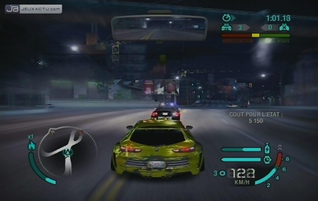 Ce défi canyon est le point culminant du mode "Carrière" de Need For Speed : Carbon. Comme le précédent opus, vous aurez droit à la même mise en scène avec des acteurs incrustés dans le moteur graphique du jeu. On aime, ou on n’aime pas. Mais tout ce petit monde s’agite afin de mettre sur pied une guerre des gangs qui divise Canyon Carbon. C’est très à la mode ces derniers temps et Electronic Arts ne va pas se priver. En ouvrant le menu "Exploration", vous remarquerez que la ville est découpée en zones, elles-mêmes colorées de différentes façons. C’est comme ça que vous pourrez zieuter sur le contrôle des territoires des différentes bandes. Pour inverser la tendance, il faudra gagner un maximum de courses avant que les oreilles d’un boss ne chauffent et qu’il ne vienne en personne vous défier dans le canyon. Dit comme ça, ça paraît simple mais il a une chose qu’on aurait tendance à oublier : la police. Comme pour Need For Speed : Most Wanted, les forces de l’ordre viendront s’immiscer dans vos épreuves alors que vous n’avez pas encore franchi la ligne d’arrivée. Pire encore, après avoir gagné ou perdu une épreuve, les flics vous poursuivront jusqu’à ce que vous arriviez à vous en dépêtrer. Et c’est là toute la difficulté du challenge. Les policiers vous suivent à la trace, rameutent des coéquipiers, quadrillent la ville et grimpent en agressivité tant et si bien que les courses-poursuites peuvent durer de très longues minutes avant de trouver le moyen de fuir. Pour se faire tous les moyens sont bons. Vous pouvez utiliser le super contrôle (X) qui ralentit l’action et améliore votre conduite l’espace d’un instant. Vous avez également le droit de foncer dans certains décors destructibles qui formeront des barrages et lorsque que la jauge en haut de l’écran basculera de "Arrestation / Evasion" en "Hors de Portée", vous devrez vous faire tout petit et trouver des planques où vous cacher. Mais le moins que l’on puise dire, c’est que ces situations durent beaucoup plus longtemps que les courses en elles-mêmes et donne un petit côté intensif à Need For Speed : Carbon. Cette option est également disponible en mode multijoueur, amusant !
