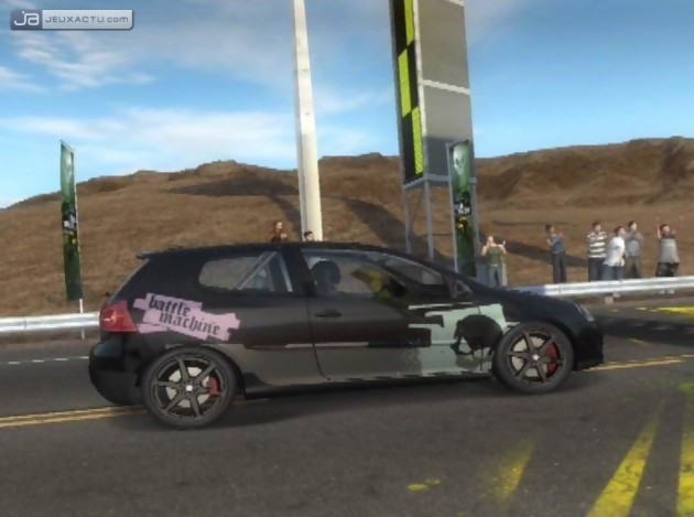 Need For Speed : ProStreet ne brûle pas les yeux comme on pouvait le croire. C'est simple : le jeu est juste un peu plus beau que Juiced 2 : Hot Import Nights, juste un peu. Le constat peut s'avérer sévère, mais s'impose tellement le titre d'Electronic Arts enchaîne les bourdes techniques. En commençant par ce fichu clipping de boucher qui met au supplice la console, dès que les détails graphiques se multiplient à l'écran. Les panneaux d'affichage, les arbres, les quelques buildings, la plupart des éléments apparaissent subitement, comme si l'on était dans un décor en Lego. Si on ne fera pas tout un plat sur l'absence d'effets pyrotechniques - Need For Speed : ProStreet se voulant plus discret que ses prédécesseurs -, on fustigera par contre les couleurs ternes qui ne mettent pas en valeur un car design pourtant convaincant. Un travail soigné a été fait sur la modélisation des véhicules, ce qui permet d'obtenir des montures aux traits fidèles aux copies originales. Mètre étalon par excellence au sein de la rédaction, les courbes de la Golf GTi sont agressives, et laissent transparaître des phares et une calandre prêts à bouffer de l'asphalte. La E92 M3 de BMW n'est pas mal non plus dans son genre, même si notre préférence ira finalement à l'Audi S3. La réalisation de ProStreet fait une fixation sur la propreté des jantes, ainsi que la brillance des disques et des étriers; un plaisir visuel qui ne laisse pas insensible. Par contre, les intérieurs sont quasi inexistants, que ce soit sur la piste - pas de vue en cockpit - ou dans le garage, de grosses vitres teintées empêchant par moments de toucher de la manette le cuir ou l'alcantara. La gestion des dégâts permet de bénéficier d'une déformation de la carrosserie crédible, et d'une multitude de dommages collatéraux - rétroviseurs et pare-chocs qui pendouillent, pare-brise fêlé, phares brisés... - qui ajoutent un certain réalisme au titre, même si cela n'a finalement aucune incidence sur la conduite.