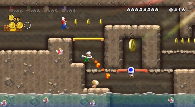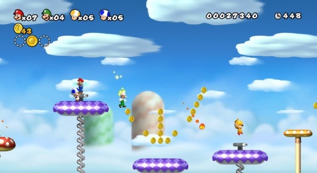 Mais qu’importe ! Si l’aventure solo reste néanmoins l’attraction première de ce New Super Mario Bros. Wii, Nintendo préfère capitaliser et valoriser son jeu par son aspect communautaire, grâce à l’intégration du mode multijoueur. C’est lui qui est d’ailleurs mis en exergue, jusqu’au choix de la jaquette, avec la possibilité de faire l’aventure jusqu’à quatre joueurs. Luigi et deux autres Toad se joignent alors à Mario pour sauver la princesse Peach, cette fois-ci aux prises de Bowser Jr. Seulement voilà, comme on pouvait le deviner, le multi de New Super Mario Bros. Wii semble factice, à tel point que certains niveaux deviennent carrément impraticables à plusieurs. La nature étant ainsi faite, les premiers essais à quatre tournent rapidement au règlement de comptes, certains collègues de bureau préférant nous jeter dans le vide que de se serrer les coudes pour passer les obstacles. Aux antipodes d’un LittleBigPlanet qui a été pensé pour le multi, New Super Mario Bros. Wii ne fait que joindre des bouts pour tenter d’apporter un semblant de jeu coopératif. En réalité, il faut se tourner vers le mode "Collecte de pièces" pour que l’on s’amuse véritablement. L’objectif est on ne peut plus simple : ramasser le maximum de pièces pour espérer sortir vainqueur de la rixe. Les coups foireux s'enchaînent, les coups vicieux aussi et c'est un régal que de vouloir mettre à mal son voisin. L'euphorie est néanmoins stoppée en raison de ces freezes intempestifs dès qu'un joueur récupère un item ou qu'il meure tout simlement. En termes de fluidité, on a vu mieux, c'est une certitude. Heureusement, Nintendo a pris le temps – et le soin – de créer des niveaux spécialement pour ce mode, histoire de prouver qu’il ne se contente plus de recycler des idées déjà utilisées ailleurs.