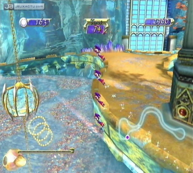 Techniquement, on regrette que la qualité d’un Super Mario Galaxy fasse encore figure d’exception sur Wii. NiGHTS : Journey of Dreams ne fait pas vraiment honneur au travail artistique mené en amont. Même si lancé à pleine vitesse, le jeu nous donne l’impression de nager au milieu d’explosions colorées aux effets pyrotechniques plutôt plaisants, le moindre temps mort ou la première cut-scene venue nous ramènera bien vite sur Terre. En y regardant de plus près, on constate bien vite le manque de soin général apporté aux textures qui pourront franchement apparaître comme grossières à certains moments. De même, les différents modèles 3D n’ont semble-t-il pas été créés pour faire l’unanimité, car ce qui pourra être ravissant en artworks ou en CG est tout simplement raté une fois plongé l’interactivité de Nightopia. Heureusement le Monde des Rêves se laisse encore traverser agréablement, puisque du côté de la prise en main, aucune surprise n’est à signaler. C’est simple et intuitif. NiGHTS : Journey of Dreams utilise en tout et pour tout qu’une seule touche en plus de l’outil de déplacement (pointeur de la Wiimote – Vision Mentale ici – lorsqu’elle est utilisée seule, ou stick analogique pour les autres configurations), ce qui le rend évidemment accessible au plus grand nombre. Les heureux joueurs ayant goûté au premier opus retrouveront sans peine leurs marques et la palette de mouvements si caractéristique du virevoltant bouffon violet. Drill Dash pour foncer vers les Nightmarens, Paraloop pour les envoyer dans le My Dream ou pour s’emparer des Blue Chips environnant. Rien de bien nouveau en somme, si ce n’est l’apparition des Personas, un ajout dont l’intérêt peut sembler quelque peu superflu. Une fois équipé d’un de ses masques, NiGHTS disposera d’aptitudes supplémentaires qui nous ont seulement permis de venir à bout de deux boss, ce qui est bien maigre pour un de seules éléments inédits de ce Journey of Dreams. Car ne nous y trompons pas, cet épisode est avant tout un prolongement de Into Dreams, avec toujours ces mêmes rails liberticides qui peuvent malheureusement paraître désuets à notre époque. De la même manière, la durée de vie en ligne droite est toujours aussi brève, comptez 7 heures de jeu environ, même si les plus fans savent que la replay value passera forcément par la recherche ininterrompue de la note maximale.