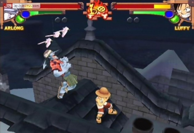 Bien évidemment pour un manga de la trempe de One Piece, il était impossible pour Bandai de passer à côté du jeu de baston, le genre idéal pour retranscrire avec une certaine fidélité l’histoire de la série ou du manga, c’est vous qui choisissez. Pour mettre en œuvre ce pugilat, Banda a fait appel à GANBAR!ON, connu pour avoir mis au monde le pas trop mal Jump Super Stars sur DS. Mais pour varier un peu leur quotidien, GANBAR!ON a décidé d’aller puiser leurs inspirations du côté de Power Stone, le sympathique jeu de combat signé Capcom et sorti sur Dreamcast en 1999. Pour ceux qui n’auraient pas encore tilté, sachez que les combats ne se déroulent pas de la même manière que les jeux de baston en 3D habituels. Tout d’abord, l’angle de vue se est aérien même si par moments, la caméra n’hésitera pas à se rapprocher es protagonistes pour amplifier l’impact de certains coups. Ensuite, le joueur est totalement libre de ses déplacements dans la zone de combat, un espace qui sera truffé de bonus et autres pièges qui participeront également au résultat du match. L’idée plutôt sympathique au départ et qui fonctionne à merveille dans Power Stone montre rapidement ses faiblesses. Pour commencer, les décors sont peu inspirés et même si on retrouve pas mal d’éléments issus de l’univers de la série, on aurait souhaité voir des environnements plus excitants en matière de level design et surtout un minimum d’interactions. De manière générale, ces décors se contentent de s’étaler sur un seul niveau alors qu’il aurait été plus intéressant de pouvoir évoluer dans les hauteurs ou pourquoi pas détruire un sol pour passer au niveau inférieur. Autant d’idées qui avaient déjà été vues dans la série Power Stone et qui ne trouvent pas preneur chez One Piece Grand Battle. C’est bien dommage car d’autres trouvailles tels que la possibilité de faire appel à un personnage tiers (façon Striker) apporte un peu de peps aux combats.