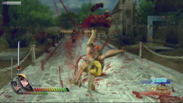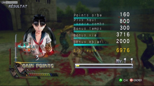 Trois personnages seront jouables au fur et à mesure des niveaux. Tout d’abord, vous incarnerez les sœurs Imichi, Aya et son maillot de bain rikiki puis Saki, dont la tenue type d’écolière japonaise ravira à coup sûr les otakus. Plus tard, elles seront rejointes par la mystérieuse Emma qui n’a pas son pareil pour manier les armes à feu et laisser apparaître une poitrine opulente. Il y a de quoi se rincer l’œil d’autant plus qu’Onechanbara : Bikini Samurai Squad offre un mode "Habillage" qui permettra d’assouvir ses pulsions de voyeur en personnalisant la garde-robe des héroïnes. Moins il y a de tissu, plus on apprécie. Les demoiselles ont chacune un style de combat propre. Aya, par exemple, est aussi efficace avec ses katanas qu’avec ses shurikens ; pratiques pour se débarrasser des ennemis à distance. Au contraire, sa petite sœur usera de sa rapidité légendaire pour rejoindre une horde de zombies et les découper en morceaux. Les deux miss pourront également changer de style de combat en cours de mission en se battant avec une ou deux épées. A contrario, Emma optera pour les mitraillettes, les fusils à pompe et autres grenades explosives. Son métier de flic y est pour quelque chose. Les dégâts seront peut-être plus conséquents mais le temps de rechargement de chaque pétoire demandera de longues secondes. Et c’est là qu’Onechanbara : Bikini Samurai Squad tente une certaine subtilité, notamment avec les frangines qui devront régulièrement nettoyer la lame de leurs épées au risque de voir les dégâts de leurs armes diminuer. Lorsque cette dernière est entièrement imbibée de sang, elle se plantera dans le corps des ennemis sans faire le moindre dégât. Méfiance donc ! Pour ce qui est des combos, seuls deux boutons permettent d’enchaîner les coups. On est donc bien loin de Ninja Gaiden et consorts. Et ne pensez même pas aux enchaînements aériens, il n’y en a pas. Les sauts sont complètement ratés et desservis par une raideur affligeante des bonnes femmes. On a beau trancher comme un beau diable, la mayonnaise ne prend pas, même lorsqu’on passe en mode Furie. Cet état de rage – disponible uniquement avec Aya et Saki – augmente considérablement les dommages causés et la rapidité des attaques, mais en contrepartie, votre barre de santé diminuera inexorablement à moins d’utiliser certains items récoltés sur les corps des zombies.