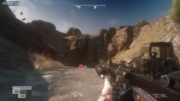 Heureusement, les moments d'action ne sont pas absents pour autant. La campagne solo, comme les missions annexes destinées à être jouées en ligne, se focalise sur un groupe d'infanterie constitué de quatre soldats. De base, cette unité Bravo regroupe un fantassin, un grenadier, un éclaireur et un mitrailleur. Il est possible de changer la classe de chaque perso, mais surtout de faire incarner chacun d'entre eux par un joueur différent. Nous ne saurions trop vous conseiller de jouer en coop, car le jeu est nettement plus intéressant ainsi. En solo pur, on doit subir une IA alliée pas toujours finaude. Nos coéquipiers virtuels ne sont ni très malin, ni très efficaces. On passe donc son temps à les soigner et à aligner des cibles dont ils auraient très bien pu s'occuper en théorie. Le système de soins évite évidemment toute hérésie à base de santé qui remonte d'elle-même, et complexifie même le traditionnel système de medikits. La première application d'un bandage arrête le saignement (qui aboutit à la mort si on ne fait rien), et il faut un deuxième soin pour recouvrir la pleine santé. Tout cela immobilise le soldat pendant un laps de temps non négligeable, qui peut au final lui être fatal s'il reste des ennemis dans les environs. Un double système d'ordres enrichit l'aspect tactique du jeu. La première roue de commandement permet de donner une douzaine d'ordres différents à nos frères d'armes (tenez la position, suivez-moi, contournez par la gauche...) tandis que la seconde, plus rarement utilisable, sert à demander du soutien (mortier, frappe aérienne, fumigènes...). Les maps étant très vastes, le joueur peuvent vraiment aborder chaque objectif de différentes manières. Attention pour cela à éviter le mode de difficulté "normal", car les points de passage les plus adéquats sont alors indiqués à l'écran. Les modes "expérimenté" et "hardcore" sont donc nettement plus intéressants, surtout le dernier qui supprime toute indication visuelle à l'écran. Il faut alors porter une réelle attention aux ordres de missions qui nous sont donnés. Impossible de le contester, Operation Flashpoint : Red River est nettement plus riche, ouvert et réaliste que le FPS de base. Mais il sait aussi flatter les instincts callofdutiesques du joueur moyen, en lui proposant un système d'expérience permettant de débloquer de meilleurs équipements au fil du temps ("paramètres classe") et même d'améliorer les performances du héros qu'il contrôle ("progression joueur"). Un bon compromis a donc été trouvé, et tout le monde devrait pouvoir y trouver à peu près son compte.   A peu près seulement, car il subsiste quelques regrettables lacunes. Au delà des problèmes d'IA, on aurait ainsi apprécié de pouvoir se pencher sur le côté lorsqu'on est planqué derrière un obstacle (le "lean" nous semble indispensable dans un titre prônant le réalisme), tandis que les adeptes de véhicules regretteront le parti-pris "tout infanterie" de l'aventure. Mais au final, la nouvelle direction prise par la série Operation Flashpoint depuis le deuxième épisode prouve tout de même sa pertinence.