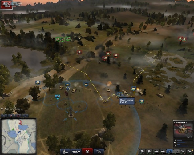 Pour nous aider dans cette tâche, une fonction de pause active permet de donner tranquillement des ordres à chaque groupe (on dirige des escouades et non des unités individuelles), en s'extrayant momentanément du tumulte ambiant. L'affichage d'icônes détaillant le type d'unités à l'écran, ou encore celui de cercles représentant la portée et la visibilité des troupes, aide également à prendre l'avantage sur l'adversaire. D'une manière générale, le jeu se montre bien plus accessible qu'il n'y paraît au premier abord. Dans la campagne solo, le joueur est en permanence guidé par une succession d'objectifs très précis, et dans certaines missions des renforts sont même automatiquement envoyés par un général ami lorsqu'on en vient à perdre trop d'unités. Heureusement, cette aide est limitée et si l'on en abuse, on finit tout de même par perdre la mission pour de bon. De plus, chaque mission se solde par une évaluation de nos performances, qui influe directement sur le nombre de points de victoire obtenus. Loin d'être anecdotiques, ces points permettent d'améliorer au fil de la campagne les capacités de l'infanterie, de l'artillerie et des chars (portée, dégâts, résistance...). Cette petite touche tactique supplémentaire est forcément bienvenue. Le jeu se dote également d'un mode cinématographique assez plaisant. A tout moment, on peut l'actionner pour admirer les combats au plus près. L'écran se pare alors de bandes horizontales noires, l'interface disparaît et la caméra n'a de cesse d'effectuer des changements d'angle et des mouvements de travelling afin de renforcer l'aspect visuel de l'action. Le rythme du jeu étant parfois assez lent, cela permet de passer le temps agréablement lorsqu'on est sûr qu'un assaut se déroulera bien sans autre intervention de notre part. La mise en scène de ces séquences de jeu n'égale tout de même pas celle des cinématiques, qui mélangent habilement des images d'archives et des éléments 3D, le noir et blanc et la couleur, ainsi que des informations textuelles et des effets spéciaux de bon goût... Ce point de détail est une véritable réussite, qui ne suffit hélas pas à faire oublier les quelques défauts du jeu. Le plus important d'entre eux est sans conteste le contexte historique choisi. Non seulement on nous ressert de la seconde guerre mondiale à la louche, mais il s'agit en plus des sempiternelles mêmes missions, déjà jouées et rejouées sous toutes les formes (FPS, RTS...). En effet, les deux campagnes solo, qui se concentrent sur l'année 1944, narrent la bataille de Normandie et la libération de Paris par les américains d'un côté, et l'opération biélorusse qui opposa l'armée allemande aux forces soviétiques de l'autre. A croire que les pays européens envahis n'ont joué aucun rôle dans la guerre et qu'il ne s'est rien passé avant l'entrée des Etats-unis dans le conflit... D'autres reproches plus prosaïques peuvent également être émis, à commencer par quelques soucis audio. On remarque ainsi de nombreux ratés dans l'enchaînement des instructions vocales, et les interlocuteurs se font carrément muets dans le didacticiel. Ce dernier soufre de plus d'un problème de conception assez singulier : il est parfois possible de passer à l'objectif suivant sans même remplir celui que l'on nous demande d'effectuer, quitte à ne pas savoir refaire l'action en question une fois dans le jeu à proprement parler. On notera également quelques rares problèmes de localisation ("ne laissez pas les Allemands s'échapper" alors que les troupes en fuite sont soviétiques) et l'obligation d'inscrire le jeu sur Steam, ce qui interdit par la même la revente du DVD sur le marché de l'occasion.