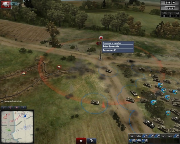 Pour nous aider dans cette tâche, une fonction de pause active permet de donner tranquillement des ordres à chaque groupe (on dirige des escouades et non des unités individuelles), en s'extrayant momentanément du tumulte ambiant. L'affichage d'icônes détaillant le type d'unités à l'écran, ou encore celui de cercles représentant la portée et la visibilité des troupes, aide également à prendre l'avantage sur l'adversaire. D'une manière générale, le jeu se montre bien plus accessible qu'il n'y paraît au premier abord. Dans la campagne solo, le joueur est en permanence guidé par une succession d'objectifs très précis, et dans certaines missions des renforts sont même automatiquement envoyés par un général ami lorsqu'on en vient à perdre trop d'unités. Heureusement, cette aide est limitée et si l'on en abuse, on finit tout de même par perdre la mission pour de bon. De plus, chaque mission se solde par une évaluation de nos performances, qui influe directement sur le nombre de points de victoire obtenus. Loin d'être anecdotiques, ces points permettent d'améliorer au fil de la campagne les capacités de l'infanterie, de l'artillerie et des chars (portée, dégâts, résistance...). Cette petite touche tactique supplémentaire est forcément bienvenue. Le jeu se dote également d'un mode cinématographique assez plaisant. A tout moment, on peut l'actionner pour admirer les combats au plus près. L'écran se pare alors de bandes horizontales noires, l'interface disparaît et la caméra n'a de cesse d'effectuer des changements d'angle et des mouvements de travelling afin de renforcer l'aspect visuel de l'action. Le rythme du jeu étant parfois assez lent, cela permet de passer le temps agréablement lorsqu'on est sûr qu'un assaut se déroulera bien sans autre intervention de notre part. La mise en scène de ces séquences de jeu n'égale tout de même pas celle des cinématiques, qui mélangent habilement des images d'archives et des éléments 3D, le noir et blanc et la couleur, ainsi que des informations textuelles et des effets spéciaux de bon goût... Ce point de détail est une véritable réussite, qui ne suffit hélas pas à faire oublier les quelques défauts du jeu. Le plus important d'entre eux est sans conteste le contexte historique choisi. Non seulement on nous ressert de la seconde guerre mondiale à la louche, mais il s'agit en plus des sempiternelles mêmes missions, déjà jouées et rejouées sous toutes les formes (FPS, RTS...). En effet, les deux campagnes solo, qui se concentrent sur l'année 1944, narrent la bataille de Normandie et la libération de Paris par les américains d'un côté, et l'opération biélorusse qui opposa l'armée allemande aux forces soviétiques de l'autre. A croire que les pays européens envahis n'ont joué aucun rôle dans la guerre et qu'il ne s'est rien passé avant l'entrée des Etats-unis dans le conflit... D'autres reproches plus prosaïques peuvent également être émis, à commencer par quelques soucis audio. On remarque ainsi de nombreux ratés dans l'enchaînement des instructions vocales, et les interlocuteurs se font carrément muets dans le didacticiel. Ce dernier soufre de plus d'un problème de conception assez singulier : il est parfois possible de passer à l'objectif suivant sans même remplir celui que l'on nous demande d'effectuer, quitte à ne pas savoir refaire l'action en question une fois dans le jeu à proprement parler. On notera également quelques rares problèmes de localisation ("ne laissez pas les Allemands s'échapper" alors que les troupes en fuite sont soviétiques) et l'obligation d'inscrire le jeu sur Steam, ce qui interdit par la même la revente du DVD sur le marché de l'occasion.