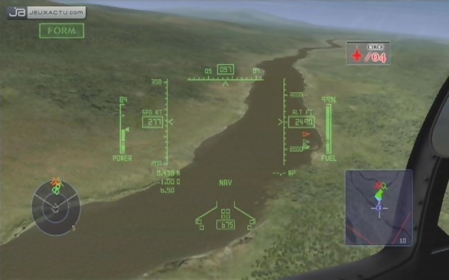 Parce que le monde connaît une crise politique sans précédent, la Energy AirForce est convoquée par l’armée américaine pour se débarrasser de menaces potentiellement terroristes. C’est un tour du monde qui attend nos 5 pilotes, prêts à embarquer dans le cockpit de guerre pour préserver la paix dans le monde. Un scénario on ne peut plus classique, simple prétexte à nous faire voyager aux quatre coins du globe. Amérique, Afrique, Asie et Europe, telles sont les terres que nous allons survoler pour profiter des paysages bien ternes de Over G Fighters. C’est en effet le premier défaut qui saute aux yeux du titre de Taito. Tristounette, la réalisation de Over G Fighters se montre surtout indigne d’une console next gen’ de la trempe de la Xbox 360. Alors que certains jeux tels que Gears of War ou Lost Planet sont autant d’arguments valables pour faire craquer le joueur qui n’a pas encore cédé à la tentation nouvelle génération, Over G Fighters fait partie de ces softs qui nous font regretter la première Xbox. Les environnements très désertiques manquent ainsi de détails et la modélisation des différentes machines de guerre du jeu (navires, véhicules terrestres) font sérieusement peine à voir. Les différents coucous proposé dans le jeu, bien qu’assez bien représentés, manquent de détails et d’effets en tout genre pour nous donner le barreau. Handicapé par une réalisation globalement morne, Over G Fighters affiche également un gameplay peu convaincant. Arcade ? Simulation ? Taito ne sait pas vraiment sur quel pied danser. Si certains éléments du gameplay (le voile noir et rouge indiquant des manœuvres dangereuses et aboutissant à l’explosion de l’appareil plus la gestion du décollage et de l’atterrissage) lorgnent du côté de la simu, d’autres aspects tels qu’une quantité quasi illimité de missiles, la facilité déconcertante avec laquelle on abat un avion ennemi et la courte durée des missions (certaines ne dépassent pas les 5 minutes de jeu) nous prouvent bien que les développeurs souhaitaient également ventiler leur gameplay. Manque de bol, le mélange ne prend pas et la sauce tourne rapidement au vinaigre. Les objectifs se montrent effectivement d’une monotonie affolante, les dogfights inexistants puisqu’on passe la plupart du temps à abattre ses ennemis à coup de missiles téléguidés. La sensation de vitesse ou d’être parmi les nuages est totalement absente et on s’amuse alors à faire des cabrioles arrières avec son engin ou foncer droit vers le sol pour espérer faire monter l’adrénaline. En vain malheureusement… Que reste-il alors à Over G Fighters ? Pas grand chose si ce n’est qu’il nous ferait presque regretter Blazing Angels, l’autre jeu d’avions récupéré par Ubisoft et qui n’était guère excitant non plus. D’oh !