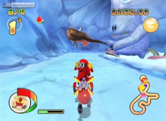 Néanmoins, il subsiste quelques idées inédites qui permettent à Pac-Man Rally d’éviter la prison ferme. Eparpillés sur la route, certains fruits (cerises, raisin ou pastèque) lorsqu’ils sont ramassés ouvrent l’accès à des passages secrets, sorte de raccourcis permettant de grignoter quelques mètres face à ses concurrents et de gagner de précieuses secondes sur le chrono final. Mais c’est bien là l’unique originalité de Pac-Man Rally, terme plutôt galvaudé quand on sait que les raccourcis dans les jeux de course existent depuis l’aube de temps. C’est donc sans surprise que l’on constate que le mode Bataille a également été repiqué de Mario Kart. Dans des arènes fermées, le but est donc d’éliminer les 7 concurrents à l’aides des bonus placés ici et là. Du déjà-vu. Mais en dehors d’un problème de personnalité, Pac-Man souffre aussi d’un manque de souplesse dans sa conduite. Et pour le coup, il aurait également fallu copier sur le maître des glissades pour obtenir un résultat aussi probant. Mais le génie n’est pas donné à n’importe qui et Namco n’a pas la carrure nécessaire pour pouvoir faire de l’ombre à Nintendo. Forcément, un sentiment de déjà-vu et de lassitude nous envahit entièrement, si bien que Pac-Man Rally restera, comme de nombreuses autres copies un énième ersatz de Mario Kart.
