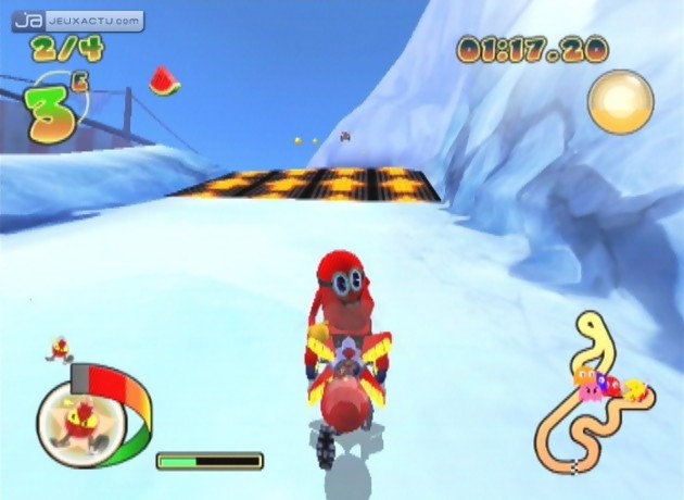 Néanmoins, il subsiste quelques idées inédites qui permettent à Pac-Man Rally d’éviter la prison ferme. Eparpillés sur la route, certains fruits (cerises, raisin ou pastèque) lorsqu’ils sont ramassés ouvrent l’accès à des passages secrets, sorte de raccourcis permettant de grignoter quelques mètres face à ses concurrents et de gagner de précieuses secondes sur le chrono final. Mais c’est bien là l’unique originalité de Pac-Man Rally, terme plutôt galvaudé quand on sait que les raccourcis dans les jeux de course existent depuis l’aube de temps. C’est donc sans surprise que l’on constate que le mode Bataille a également été repiqué de Mario Kart. Dans des arènes fermées, le but est donc d’éliminer les 7 concurrents à l’aides des bonus placés ici et là. Du déjà-vu. Mais en dehors d’un problème de personnalité, Pac-Man souffre aussi d’un manque de souplesse dans sa conduite. Et pour le coup, il aurait également fallu copier sur le maître des glissades pour obtenir un résultat aussi probant. Mais le génie n’est pas donné à n’importe qui et Namco n’a pas la carrure nécessaire pour pouvoir faire de l’ombre à Nintendo. Forcément, un sentiment de déjà-vu et de lassitude nous envahit entièrement, si bien que Pac-Man Rally restera, comme de nombreuses autres copies un énième ersatz de Mario Kart.