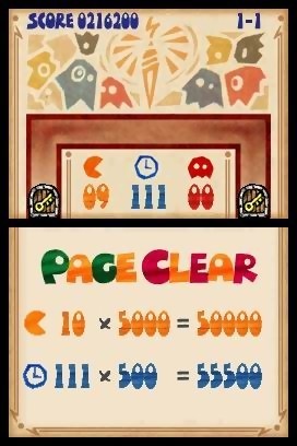 Si au début, Pac-Pix paraît d’une aisance enfantine, une fois le gameplay assimilé, la difficulté du jeu ira crescendo au fil des parties car si par malheur, il vous arrivait de voir apparaître l’écran fatidique du Game Over, il faudra alors reprendre le jeu au début du chapitre. Pas vraiment gênante au début, cette difficulté old school risque de provoquer une calvitie précoce chez les joueurs les moins patients. Ceux-là seront également confrontés à l’apparition d’une véritable stratégie pour gober tous les spectres en moins de 120 secondes. Des paramètres supplémentaires mettront votre jugeote à rude épreuve et chaque niveau a le mérite de proposer une mise en scène différente. Le jeu se découpe en plusieurs chapitres comme dans un livre. Chacun de ces chapitres est composé de 12 chapitres, eux-mêmes découpés en 5 niveaux, ce qui lui assure une durée de vie convenable. D’un point de vue technique, Pac-Pix n’est certainement pas le jeu qui poussera votre DS dans ses derniers retranchements mais possède néanmoins une belle 2D qui lui va comme un gant en velours. Le jeu s’appuie essentiellement sur son gameplay d’une originalité rafraîchissante.