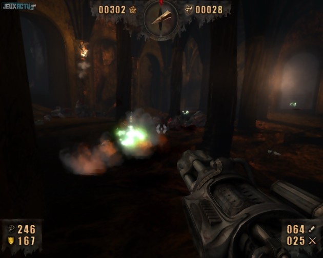 Si l'on fermera les yeux sur les apparitions magiques d'ennemis, bien pratiques pour les développeurs en manque d'imagination, on n'excusera guère leur bêtise artificielle. C'est bien simple, tous les monstres semblent obéir à une seule et unique routine de comportement : foncer droit sur le joueur. Vraiment tout droit, et en toutes cirsconstances ! Comprenez par là qu'il n'est pas rare de voir des monstres bloqués par un élément de décor placé entre eux et vous. Ils s'agglutinent alors contre l'obstacle et ne pensent même pas à le contourner. Quelquefois, les tirs de ceux placés à l'arrière viennent carrément frapper et abattre leurs collègues situés à l'avant. C'est assez rigolo à voir, surtout quand on n'a pas payé le jeu tout du moins. Ceux qui ont vidé leur porte-feuille pour se le procurer risquent de faire grise mine face à un tel spectacle. Même certains boss souffrent de ce problème, à un détail près : du fait de leur taille imposante, ils ont tendance à traverser partiellement les obstacles, ce qui ajoute encore au ridicule. Ces bugs viennent compléter une collection déjà très fournie par ailleurs. Ainsi, il arrive également au joueur de se retrouver coincé dans les décors, bien malgré lui. Dans ce cas, la seule solution consiste à recharger une partie. Le jeu prend parfois des initiatives encore plus radicales et nous balance sans ménagement sous Windows (message "Fatal Error" et autres joyeusetés). A ces soucis d'ordre technique viennent s'ajouter quelques problèmes plus conceptuels. On pense notamment à l'architecture maladroite des niveaux. Manifestement désireux d'éviter l'effet couloir, les développeurs nous ont concocté des maps sans queue ni tête, dans lesquelles on se perd parfois et qui multiplient les obstacles inopportuns. Appuyer dix fois sur la touche de saut avant de réussir à grimper sur un rocher ou voir les ennemis buter misérablement sur le moindre élément de décor un peu bas n'a franchement rien d'agréable.