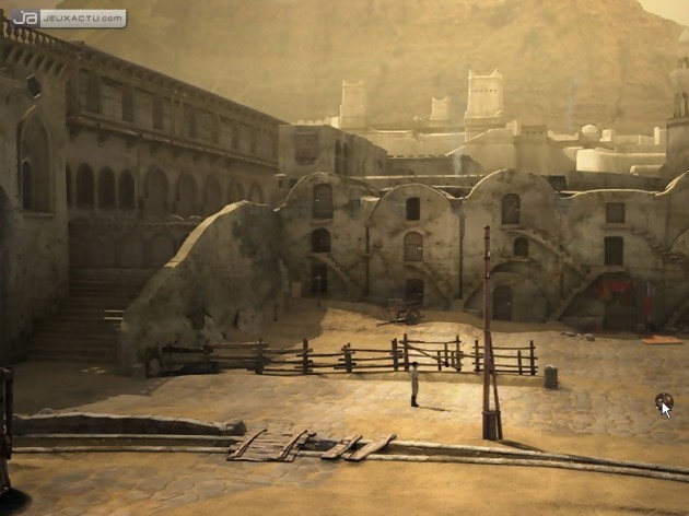 Avec la panthère, le clic enregistré n’est pas le même. Le joueur sélectionne l’endroit où la bête doit aller mais le programme sauvegarde l’endroit de l’écran ou le clic a été effectué et non pas la destination finale. A cause des changements d’orientation de la caméra consécutifs à un passage d’écran, la panthère fait parfois complètement demi tour pour revenir à l’écran initial. Un délire absolu. Ajoutez à cela des bugs tous plus originaux les uns que les autres et vous comprendrez qu’à l’instar du Canada Dry, Paradise ressemble à Syberia, ça a le goût de Syberia mais ce n’est pas Syberia. Prenons par exemple celui-ci assez cocasse. A la sortie du palais, Ann se retrouve dans une grande rue déserte. Elle doit se déplacer au bout pour lever une sorte de rideau qui lui permettra d’apercevoir le camion dans lequel elle est arrivée. Cette action a pour conséquence de déclencher une cinématique. Mais la première fois que j’ai soulevé le voile, j’ai vu le camion et il ne s’est rien passé. Au bout de deux heures de stagnation absolue, j’ai repris une ancienne sauvegarde et ça a marché. J’ai arrêté à peu près à ce moment là, la lutte contre les bugs s’avérant plus difficile que la progression dans le jeu elle-même… Dommage que le génie de Sokal soit accompagné d’une réalisation étonnamment médiocre. Un patch pourrait-il corriger la totalité des problèmes ? L’entreprise semble énorme…