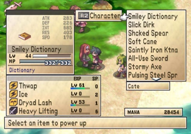 Marona vit sur Phantom Island, petite île tropicale au sable fin et à l’eau turquoise, isolée en plein cœur du monde d’Ivoire. C’est ici votre base, dans laquelle vous allez gérer votre équipe au mieux avant de partir à l’aventure. L’objet clef de ce petit coin de paradis se trouve être votre boite aux lettres. C’est là que vous réceptionnez les messages marins de vos employeurs. Grosso modo, à chacun des 20 épisodes (répartis sur quatres chapitres) correspondent un de ces petits boulots surnaturels. Il est temps de se plonger tout entier dans le système de combat concocté par les développeurs car c’est bien ici que se situe tout l’intérêt de Phantom Brave, bien au-delà d’une réalisation comme toujours désuète, avec certes des illustrations toujours plus belles et détaillées pour les cut-scenes, mais dans les faits nous nous retrouvons toujours devant une 3D isométrique pas folichonne avec des modélisations du siècle dernier. Cependant qui oserait en faire un cheval de bataille pour dénigrer un soft qui a tout d’un ténor du genre ?