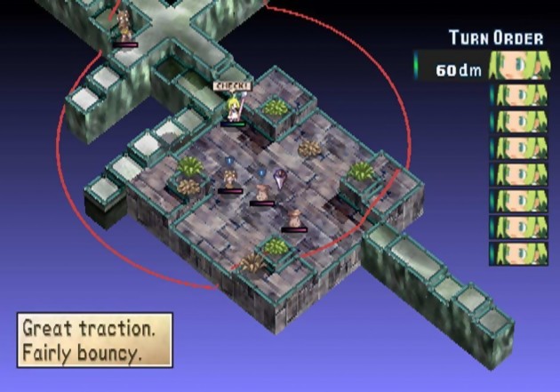 Comme il y a des limites à tout, notez cependant que les boss ne peuvent pas être éliminés de cette manière, ainsi que certains adversaires triés sur le volet. Il eût été dommage en effet de baser toute sa stratégie en vue de ne faire que des ring out. Alors c’est le petit joueur en chacun de nous qui est bien déçu. Autre grande différence avec ses grands frères, Phantom Brave permet une meilleure liberté de déplacement. Ainsi on se déplace librement sur la surface de combat, laquelle n’est plus quadrillée, je vous laisse imaginer les aléas provoqués par la gestion des dénivelés et des surfaces glissantes. Il est heureusement toujours possible d’annuler son action par une simple pression du bouton Rond. Phantom Brave ne joue plus la carte du tour par tour entre les deux camps. Le tour de chaque personnage est calculé à l’avance et visible dans une colonne sur la droite de l’écran, accentuant encore plus l’aspect stratégique des incroyables affrontements qui vous attendent. Point à ne pas négliger donc, de la caractéristique speed de votre personnage dépend sa capacité à jouer rapidement et souvent. Si j’ai écrit "speed" et non "vitesse", c’est précisément parce que Koei n’a toujours pas cru bon de proposer une localisation française. La prestation des voix anglaises, quant à elles, ne m’a pas semblé aussi réussie que celle de Disgaea, notamment le doublage de Ash, bien trop fade. Pas vraiment de quoi se laisser décourager.