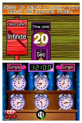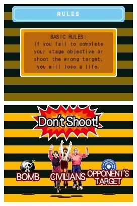Si la série Time Crisis avait su redorer le blason des jeux de tirs aussi bien en Arcade que sur consoles de salon, Namco avait trouvé à l’époque la parade parfaite pour palier au problème de la violence et rameuter à sa cause de plus en plus de joueurs. Ce remède miracle se nommait Point Blank. Le succès étant celui que nous avons connu, plusieurs opus ont fleuri au fil des années jusqu’à ce que la série perde de son charisme avec l’arrivée du monolithe noir et de ses concurrentes. Mais Namco est fin prêt à ressusciter son titre grâce à Nintendo et son incontournable console tactile. N’imaginez pas brancher par je ne sais quel miracle un gun à la machine. Avec cette conversion le G-Con s’est transformé en stylet d'un seul coup de baguette magique. Si l’accessoire change, le concept reste le même, à savoir viser les bonnes cibles, le plus rapidement possible et en évitant les malus qui traînent sur la route. Ce changement important pour la série lui permet également de basculer dans un tout autre genre à savoir la compilation de mini-jeux.