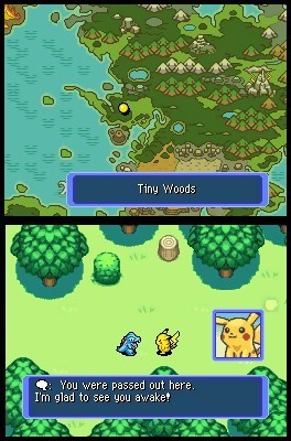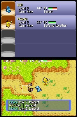 Sans s’être très éloigné du concept original, Pokémon Donjon Mystère se démarque de ses cousins sur plusieurs principes. Premièrement, on passe de l’autre côté de la barrière pour se mettre dans la peau d’un Pokémon, même si on n’apprend un peu plus tard qu’on est simplement un humain réincarné en une de ces mignonnes créatures. Pour commencer d’ailleurs, on a droit à toute une batterie de questions pour déterminer de quel Pokémon de base votre caractère se rapproche le plus. Ensuite, on est rejoint dans notre quête par un allié mais dont le type est l’inverse du notre. Ainsi, si vous êtes transformé en Bulbizarre (plante), c’est Salamèche (feu) qui viendra vous épauler, ce qui permet d’être efficace contre une bonne partie des 17 types présents dans le jeu. L’équilibre du monde des Pokémons est fortement perturbé et les catastrophes naturelles s’enchaînent sans que l’on comprenne la raison. Dans ce climat apocalyptique, la solidarité s’organise pour venir en aide aux plus démunis et c’est donc dans cet esprit que vous allez former une équipe de secours et enchaîner les interventions. Plus tard, on apprendra qu’il s’agissait d’une première épreuve avant que Gardevoir nous missionne de… sauver le monde. Comme on pouvait logiquement s’y attendre, l’histoire est niaise à souhait mais les nombreux rebondissements nous surprennent. D’abord aimé de tous, on devient vite traqué jusqu’aux confins du pays, on rénove sa base au retour pour la rendre plus attrayante et surtout on n’hésite pas à aller mettre une dérouillée aux fameux pokémons légendaires (Elector, Sulfura, Artikodin, Groudor, etc.). On en arrive même à être dupé plusieurs fois par la trame scénaristique tellement on se persuade parfois de voir défiler les crédits de fin à la sortie du donjon. Pokémon Mystère porte donc très bien son nom. On en arrive en tout et pour tout à une bonne vingtaine d’heures pour en voir le bout si tenté que l’on se consacre uniquement sur l’aventure principale.