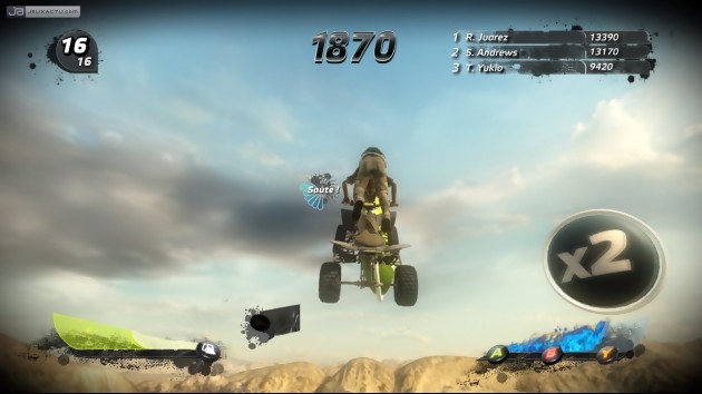 Côté modes de jeu, Pure n’est pas en reste, il est plutôt même complet. Le mode "Carrière" rebaptisé ici en "World Tour" permet d’enchaîner les courses avec l’objectif de terminer premier de sa promo. Chaque étape nous entraîne donc dans différents cadres (Etats-Unis, Mexique, Italie, Nouvelle-Zélande, Thaïlande, etc.) et propose en sus différentes épreuves qu’on retrouve d’ailleurs en mode de jeu séparés. Le mode "Course", classique, nous demande d’affronter les 15 autres concurrents dans une course où il faut mettre les gaz et enchaîner un maximum de figures pour terminer premier. Le mode Sprint, plus attentif lui, nous impose de faire le moins de sauts possibles. Les sensations sont alors intenses car la jauge d’adrénaline n’augmentant jamais, c’est tout le savoir-faire de la conduite qui est ici mis à rude épreuve. Reste alors le mode "Freestyle", sans nul doute la partie la plus dynamitée du jeu, qui mélange course de vitesse, sauts vertigineux et gestion de son pilote en même temps. Bardée d’items (bonus multiplicateur de points, accès direct aux figures spéciales, combos de tricks), chaque course est vécue avec une tension particulière puisqu’une seconde jauge fait son apparition en bas à gauche de l’écran ; il s’agit de la jauge d’essence. Grand consommateur de carburant, le quad est soumis à cette règle infaillible, celle de tomber en rade en pleine course si on ne prend pas le soin de récupérer les pastilles d’essence éparpillées sur la route. C’est évidemment la course à l’item, d’autant que les concurrents ont la fâcheuse tendance de se servir avant nous. Grisant, vraiment.