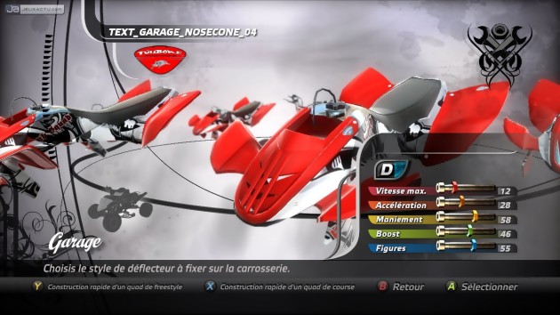 Toujours dans le souci d’être exhaustif, Pure dispose aussi d’un garage. Il permet de créer son propre quad, de l’ossature jusqu’à la carlingue, en passant par toutes les pièces indispensables à son bon fonctionnement. Evidemment, on peut personnaliser son engin grâce à différents codes couleur, mais aussi par le biais de stickers à coller – ou pas – sur son bolide. Et enfin, pour ceux qui aiment partager les sensations, reste le mode de jeu en ligne qui permet d’affronter des concurrents humains et de mesurer son talent aux quatre coins du globe. De la même manière que le jeu en solo, le frame-rate ne bronche pas d’un cil, ou rarement, ce qui offre une expérience de jeu vraiment enivrante. Un sans-faute, ou presque.