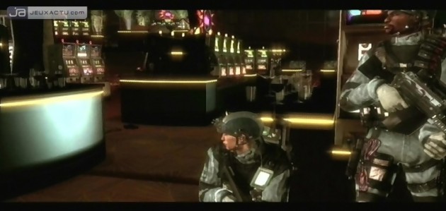 Après avoir créé votre personnage et même intégré votre visage grâce à la caméra Xbox Live Vision, vous apprendrez qu’au fil des victoires et des défaites, votre avatar gagnera de l’expérience et montera en grade ce qui lui permet de s’offrir de nouveaux équipements. En plus de personnaliser la gueule de votre héro, vous pouvez choisir de fond en comble son arsenal et sa tenue. Si d’entrée de jeu, nombreux sont les accessoires indisponibles, bien vite vous découvrirez de nouvelles armes, protections et vêtements. Et bien choisir ses accessoires est primordiale en partie notamment pour les protections. Selon les différentes parties choisies (Corps, Epaules, Bras, Jambes, Tête), le taux de protection augmentera. Vous allez me dire : "autant tout mettre à fond !". C’est là que vous vous trompez car si vous rendez votre personnage résistant aux balles, vous perdrez en mobilité. Vous devrez donc choisir un juste milieu. Et pour ce qui est du jeu en lui-même, le multijoueur est beaucoup plus tactique que le mode solo et ce n’est pas plus mal. Cependant, l’un des seuls regrets que l’on pourrait faire, c’est qu’en multi Tom Clancy's Rainbow Six : Vegas perd de son charme graphique. Déjà qu’en campagne solo, le résultat est en demi-teinte autant dire que certaines maps sont parfois très moches. Depuis Gears of War, difficile de trouver plus beau et le jeu d’Ubisoft est souvent inégal à ce niveau-là avec des niveaux plutôt réussis et d’autres décevants à cause de vilaines textures à la limite du current gen’ et des modélisations d’objets plus que basiques.