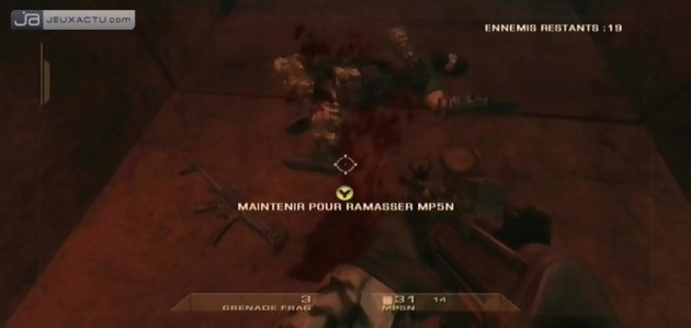 A la rigueur, même si vous vous gourez d’arsenal en entamant une mission, ce n’est pas dramatique car à vos côtés, vous retrouvez deux experts en lutte anti-terroriste qui répondront au doigt et à l’œil à vos ordres. Comme d’habitude, le bouton A permet de choisir un endroit où vos coéquipiers se mettront à couvert. Du fait de leur expérience, ils se positionneront stratégiquement par rapport au level-design et ne resteront pas bêtement plantés au milieu d’un couloir, totalement à découvert. En mode infiltration, ils ne feront que repérer les cibles, qu’elles soient ennemies ou civiles. Jung et Michael n’ouvriront le jeu que pour riposter. Au contraire, si vous voulez qu’ils fassent le boulot, vous pouvez activer le mode assaut. A ce moment-là, ils n’hésiteront pas à abattre le moindre terroriste qui passera dans leur champ de vision. Cependant, ce mode s’active automatiquement lorsque vous entrez dans une pièce. Comme d’habitude, il est possible de placer ses hommes devant une porte afin de préparer une entrée qui ne laissera personne indifférent. Et comme à chaque fois, plusieurs options s’offrent à vous : Ouverture / Nettoyage, Ouverture / Grenade Frag, Ouverture / Fumigène, Ouverture / Grenade Flash ou exploser porte. Mais le petit truc en plus dans Tom Clancy's Rainbow Six : Vegas, c’est la possibilité d’entrevoir le positionnement des ennemis grâce à la caméra serpent qui se glisse sous la porte. Bien pratique, ce petit accessoire vous permet aussi de planifier des attaques simultanées. En ciblant une autre porte, vous pouvez demander à vos hommes de s’y poster sans quitter la vue caméra ou encore lorsque vous lockez un adversaire, vous pouvez l’assigner à l’un de vos hommes qui le prendra en chasse dès l’ouverture de la porte. Parmi les nouvelles subtilités de jeu, vous pouvez également faire irruption dans une pièce par les fenêtres ou les plafonds. Selon les missions, vous trouverez des points où accrocher des cordages pour descendre en rappel seul ou accompagné de vos coéquipiers. Et une nouvelle fois, vous pourrez leur ordonner de descendre, monter ou entrer dans la pièce. Toutes ces actions tendent à rendre les opérations plus prenantes et ça marche. Mais difficile de ne pas être frustré lorsqu’on découvre avec quelle efficacité vos potes font mouche tant et si bien qu’on finit par être en retrait de l’action laissant ses coéquipiers se charger du sale boulot. Autre souci et non des moindres, l’intelligence artificielle est en dent de scie. Tantôt les adversaires vous prendront en revers, tantôt ils resteront plantés pensant être à couvert malgré deux, trois balles qui leur sifflent aux oreilles. L’ensemble de ces données donne finalement un jeu beaucoup moins tactique qu’il n’y paraît avec un sérieux penchant pour les séquences de bourrinage lorsque les ennemis débarquent de toutes parts. Et si l’un de vos coéquipiers tombent sous les balles, vous avez moyen de le soigner avant que sa jauge de santé ne tombe dans le rouge. Cette option facilite grandement la tâche pour un jeu qui n’est pas des plus longs en mode campagne. Pour pimenter d’avantage le jeu et pour gagner en séquences tactiques, il existe le mode réaliste où le moindre headshot peut s’avérer fatal.