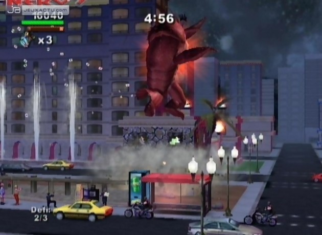 Sorti en catimini sur PlayStation 2 et GameCube, Rampage : Total Destruction signe le grand retour du trio phénomène de la série de Midway. Mais aux côtés de George le singe hystérique, Ralph le loup-garou survolté et Lizzie le lézard disproportionné, les développeurs de Pipeworks Software ont pris le soin de modéliser 29 nouveaux monstres prêts à tout pour réduire à feu et à sang Las Vegas, San Francisco, Londres, Dallas, Hong-Kong, Chicago ou encore New York. Le concept n’a pas changé d’un pouce depuis la création de la borne d’arcade dans les années 1986. Il s’agit donc de détruire les villes une à une, d’engloutir ses habitants, de résister aux forces militaires qui feront tout pour vous terrasser, de récupérer un maximum de bonus et ce sans perdre de précieuses secondes afin de décupler son high-score en fin de partie. Mais pour pimenter le Mode Campagne, les développeurs ont eu la sage décision d’intégrer quelques objectifs à atteindre afin de faire évoluer votre avatar. C’est ainsi que pour récupérer tel ou tel item, il faudra casser les immeubles les uns après les autres en s’agrippant aux fenêtres, en éclatant les vitres ou en détruisant ses fondations. Mais dans l’euphorie du saccage, il faut faire attention à ce que vous ramassez. En plus des bonus, Rampage : Total Destruction fourmille de malus néfastes à votre niveau de santé laquelle est régulièrement réduite par les tirs d’artillerie des hélicoptères ou des soldats au sol. Et lorsque les militaires ne vous mettent pas des bâtons dans les roues, c’est le décor lui-même qui peut devenir dangereux. Méfiez-vous des immeubles qui s’écroulent, des fuites de gaz ou des geysers. Autant dire que jouer à Rampage n’est pas de tout repos mais ça vous le savez déjà si vous avez déjà pratiqué par le passé un des nombreux épisodes de la série. Mais avec la Wii, il faudra mettre la main à la pâte grâce à la Wiimote. Tenue en position verticale, celle-ci permet à la fois de diriger sa créature, de balancer quelques mandales bien placées, bref de déchaîner sa furie sur de pauvres victimes innocentes. Les boutons A et B servent respectivement à taper et à sauter, c’est ensuite que vous vous occuperez de diriger la Wiimote vers le haut, le bas, la gauche ou la droite, pour orienter vos attaques. Cela aurait pu être un bon point pour Rampage : Total Destruction si seulement Gilman, Rhett, Boris et compagnie étaient maniables. Le jeu pédale dans la semoule lorsqu’il s’agit de faire avancer ou reculer son personnage en orientant la Wiimote vers le haut ou vers les bas. Notre poignet se contorsionne dans des positions impossibles pour un résultat pas toujours évident. Finalement, le gameplay est à l’image du concept même de Rampage : brouillon et répétitif. Si les fans de la série prendront un malin plaisir à réduire en poussière les cités et à redécouvrir les opus originaux de Rampage, le joueur lambda finira par se lasser au bout de quelques stages. Heureusement, l’option multijoueur et notamment le mode coopération offre un regain d’intérêt au titre. Enfin et pour terminer, Rampage : Total Destruction n’est pas le genre de jeu à exploiter à fond les capacités de la console, comme beaucoup de productions malheureusement, mais conviendra à tous avec ses graphismes colorés et bourrés d’humour malgré d’innombrables bugs de collision.