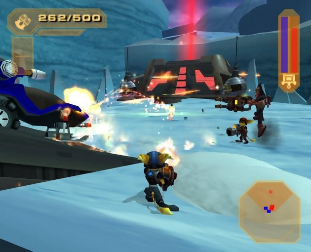La moitié des décors n’est pas sans rappeler le volet précédent. Le schéma que suit le jeu est également familier au possible et on a la vague impression de jouer au même jeu d’il y a un an, ce qui inclut que les défauts de Locked & Loaded sont toujours présents. Caméra parfois capricieuse et des personnages qui tardent (très rarement mais tout de même) à répondre et exécuter les tâches qu’on leur demande. On chipote, on chipote certes mais la moindre des choses pour un troisième épisode est d'au moins de corriger les défauts de l’opus passé. Ce n’est malheureusement pas le cas ici. Les vastes environnements colorés manquent toujours autant de vie et d’animation et on enchaîne les niveaux - toujours représentés par différentes planètes sur lesquelles il faut se rendre à l’aide de votre engin volant (qui n’a lui non plus pas changé d’un polygone) – sans qu’ils nous marquent l’esprit. Pour autant leur immensité et les objectifs à accomplir apportent toujours un challenge de taille qui ne nuit en rien quant à la progression du jeu. Une progression qui ne se fera pas sans douleur car si vous ne prenez par la peine de récupérer un maximum de boulons ou de faire évoluer votre arsenal, vous allez rapidement tomber dans une impasse. La difficulté croissante des missions nécessitera quelques heures d’entraînement avant de pouvoir les passer avec succès. Les plus malins se serviront de leur sauvegarde de Ratchet & Clank 2 : Locked & Loaded pour récupérer l’ensemble des armes disponibles dans le volet précédent à un faible tarif. Dans le cas contraire, il faudra vous saigner les veines pour espérer acheter la globalité de la nouvelle trentaine d’armes mises à disposition, sans oublier la combinaison de Ratchet qui se vend toujours à un prix exorbitant ! Cette pléthore d’armes surpuissantes va vous permettre de venir à bout de la nuée d’ennemis qui vous attaqueront de tous les recoins. N’hésitez d’ailleurs pas à zieuter tout autour de vous pour glaner les fameux boulons platinum ou les cristaux d’égouts échangeables contre un bon sachet d’écrous. Idéal pour se faire un max de pognon et acheter plus rapidement de nouvelles armes et autres objets. A l’instar des volets précédents, plus vous utiliserez vos armes et plus elles gagneront en puissance de frappe, pouvant ainsi évoluer quatre fois. Bien sûr, on prend toujours autant de plaisir à diriger notre duo de choc mais on se demande parfois si l’achat de ce troisième opus est indispensable surtout si on possède déjà l’excellentissime Ratchet & Clank 2 : Locked & Loaded. Mais chez Sony et Insomniac Games, on est loin d’être idiot et pour donner envie aux consommateurs de débourser 60 € de plus, on a décidé d’incruster un mode multijoueur qui est de surcroît jouable en ligne. Une excellente idée mais encore faut-il qu’elle tienne la route.