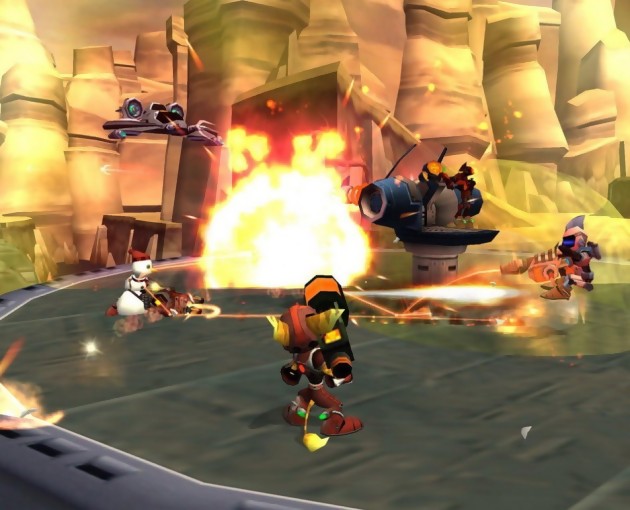 Pour la deuxième fois de suite, Ratchet et Clank ont sauvé la galaxie du Mal qui la rongeait, les propulsant de cette manière au rang de superstars. Depuis, nos deux troubadours se la coulent pépère et profitent de leur notoriété pour devenir les vedettes d’une série TV. Très vite, notre duo de choc va avoir de nouveau du pain sur la planche puisque une nouvelle menace se profile à l’horizon sous les traits du Docteur Nefarious. Il est donc normal pour Ratchet et Clank d’intervenir au plus vite. Tiens donc, ce scénario pas original pour un sou, résonne-t-il dans vos esprits comme une espèce d’écho ? Mais pourquoi donc ? Inutile de chercher midi à quatorze heures, l’histoire de Ratchet & Clank 3 est à peu de choses près la même que son illustre prédécesseur. Un coup de Calgon de la part des scénaristes d’Insomniac Games ? Un excès de flemme qui leur permet ainsi de concentrer leurs efforts vers le reste du jeu ? Finalement, l’histoire de Ratchet & Clank 3 n’occupe de toute manière qu’une place infime dans l’intérêt du jeu et est simple prétexte à une succession de séquences d’actions qui mélangent les genres avec toujours autant de panache. Toutefois, si on part de l’adage selon lequel une suite se doit de faire plus fort, on pourrait penser que les créateurs de Spyro le dragon se reposent sans vergogne sur leurs lauriers. Une éventualité qui tend franchement à se confirmer…