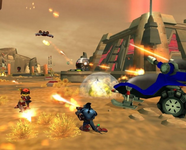 Si les différences entre les deux premiers volets étaient évidentes et flagrantes, celles entre Ratchet & Clank 2 : Locked & Loaded et Ratchet & Clank 3 se discernent à la loupe. Pour commencer, le moteur du jeu n’a pas évolué d’un iota. Est-ce un drame pour autant ? Nullement ! D’autant plus qu’il a déjà fait ses preuves et affiche une profondeur de champ qui impressionne toujours autant. Les graphismes, eux non plus, n’ont guère changé et s’avèrent être toujours d’une grande qualité. Aliasing absent et clipping à peine perceptible, non vraiment rien à redire sur le plan technique. Le gameplay pose problème peut-être ? Des phases de plates-formes aux séquences de shoot dans l’espace en passant par des courses de bolides ou des scènes de gunfights dans des arènes spéciales, sans oublier une pincée de jeu de rôle avec l’évolution de vos personnages et de vos armes, non rarement un jeu aura aussi parfaitement marié les genres. Quelques petites trouvailles telles que la possibilité de se transformer en créature extraterrestre grâce à un tyrraguisement et de causer dans la langue locale en appuyant sur le bon bouton au moment opportun (fendard), sauter en parachute (jouissif), faire déplacer un singe en lui jetant des bananes ou bien encore prendre les commandes de Qwark dans un mini-jeu dans la plus pure tradition des softs de plates-formes d’antan, ajoutent encore plus de crédit à un gameplay déjà bien fourni. De ce côté-là, ça reste donc impeccable. Mais où diantre se situe ce problème qui semble visiblement nous décevoir ? Inutile de faire monter la sauce plus longtemps et crevons cet abcès fissa. Ratchet & Clank 3 n’est pas la révolution que tout amateur d’action/plate-forme était en droit d’attendre. Attention, ne me faites pas dire ce que je n’ai nullement pensé, Ratchet & Clank 3 est loin, très loin d’être un mauvais jeu. Cependant, étant donné le peu de temps qui sépare les deux derniers volets, le sentiment de déjà-vu ou d’un jeu à peine remâché nous envahit dès les premières minutes de jeu.