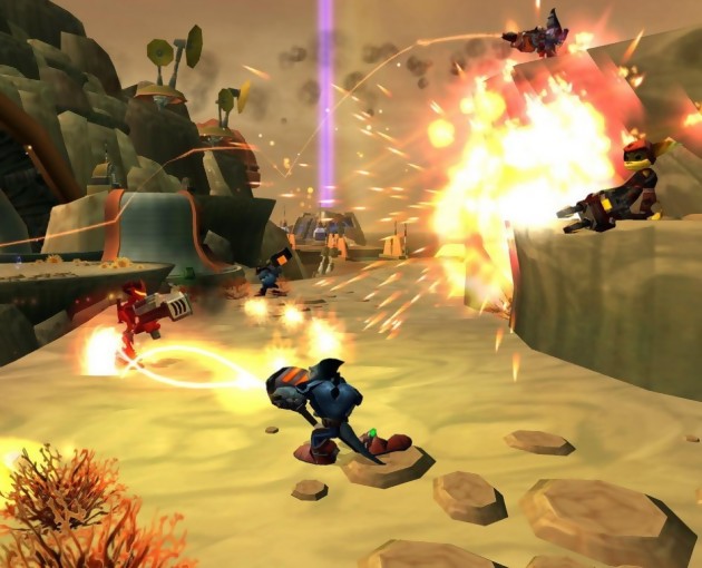 La moitié des décors n’est pas sans rappeler le volet précédent. Le schéma que suit le jeu est également familier au possible et on a la vague impression de jouer au même jeu d’il y a un an, ce qui inclut que les défauts de Locked & Loaded sont toujours présents. Caméra parfois capricieuse et des personnages qui tardent (très rarement mais tout de même) à répondre et exécuter les tâches qu’on leur demande. On chipote, on chipote certes mais la moindre des choses pour un troisième épisode est d'au moins de corriger les défauts de l’opus passé. Ce n’est malheureusement pas le cas ici. Les vastes environnements colorés manquent toujours autant de vie et d’animation et on enchaîne les niveaux - toujours représentés par différentes planètes sur lesquelles il faut se rendre à l’aide de votre engin volant (qui n’a lui non plus pas changé d’un polygone) – sans qu’ils nous marquent l’esprit. Pour autant leur immensité et les objectifs à accomplir apportent toujours un challenge de taille qui ne nuit en rien quant à la progression du jeu. Une progression qui ne se fera pas sans douleur car si vous ne prenez par la peine de récupérer un maximum de boulons ou de faire évoluer votre arsenal, vous allez rapidement tomber dans une impasse. La difficulté croissante des missions nécessitera quelques heures d’entraînement avant de pouvoir les passer avec succès. Les plus malins se serviront de leur sauvegarde de Ratchet & Clank 2 : Locked & Loaded pour récupérer l’ensemble des armes disponibles dans le volet précédent à un faible tarif. Dans le cas contraire, il faudra vous saigner les veines pour espérer acheter la globalité de la nouvelle trentaine d’armes mises à disposition, sans oublier la combinaison de Ratchet qui se vend toujours à un prix exorbitant ! Cette pléthore d’armes surpuissantes va vous permettre de venir à bout de la nuée d’ennemis qui vous attaqueront de tous les recoins. N’hésitez d’ailleurs pas à zieuter tout autour de vous pour glaner les fameux boulons platinum ou les cristaux d’égouts échangeables contre un bon sachet d’écrous. Idéal pour se faire un max de pognon et acheter plus rapidement de nouvelles armes et autres objets. A l’instar des volets précédents, plus vous utiliserez vos armes et plus elles gagneront en puissance de frappe, pouvant ainsi évoluer quatre fois. Bien sûr, on prend toujours autant de plaisir à diriger notre duo de choc mais on se demande parfois si l’achat de ce troisième opus est indispensable surtout si on possède déjà l’excellentissime Ratchet & Clank 2 : Locked & Loaded. Mais chez Sony et Insomniac Games, on est loin d’être idiot et pour donner envie aux consommateurs de débourser 60 € de plus, on a décidé d’incruster un mode multijoueur qui est de surcroît jouable en ligne. Une excellente idée mais encore faut-il qu’elle tienne la route.