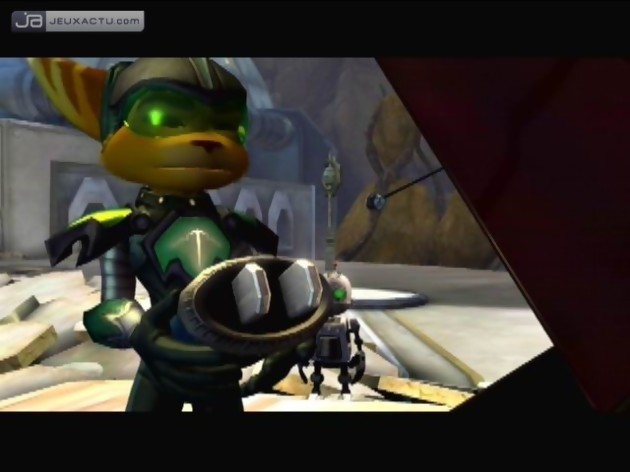 Car c'est bien dans ce domaine que la série a toujours brillé, et brille encore. On commence avec quelques armes de base, mais l'intérêt, c'est d'en acheter de nouvelles régulièrement grâce aux boulons que vous récoltez en tuant les ennemis et en détruisant pas mal d'éléments du décor. Et là, Insomniac s'est lâché. Bah oui, marre des mitrailleuses, des fusils, des guns vus, revus et archi revus ! Ici, on retourne aux sources du jeu vidéo : le fun, le délire, l'imagination. Alors préparez-vous à lancer des tornades contrôlables avec le Sixaxis, à demander de l'aide à un petit robot, à projeter des disques tranchants, à lancer des boules à facette pour faire danser vos adversaires, à les transformer en pingouin, à leur envoyer des centaines d'abeilles tueuses... Et bien sûr, en plus de tout ça, on a quand même des engins plus classiques mais qui font toujours dans la démesure avec des missiles ultra puissants, des tirs multiples etc. La plupart des armes sont même upgradables, et ce de deux façons. La première consiste simplement à les utiliser : plus on s'en sert, plus elles gagnent en expérience, franchissent des niveaux et donc gagnent en puissance. Une fois le cinquième et dernier niveau atteint, on a même droit à une petite fonction supplémentaire. La deuxième méthode est plus classique : vous pouvez dépenser le raritanium que vous amassez (comme les boulons, mais c'est beaucoup moins abondant) pour acheter diverses améliorations. Autant dire qu'au final, on dispose d'un sacré choix ! Et si on peut finir le jeu en jouant les radins et en achetant le moins possible, on a quand même tout intérêt à se faciliter la vie en agrandissant régulièrement sa collection. Si bien qu'avec une talle palette, deux joueurs n'auront pas le même équipement : à chacun de trouver les engins qui lui font plaisir et qu'il estime être le plus efficaces. Et rassurez-vous, si vous êtes du genre à vouloir tout essayer, une fois l'aventure terminée, vous pouvez recommencer en conservant tout votre matériel. Le jeu devient alors plus généreux en boulons, et vous pouvez donc acheter ce qu'il vous manquait et même découvrir encore de nouvelles armes. A noter que les boulons vous permettent aussi d'acheter des armures rendant Ratchet plus résistant aux attaques ennemies.