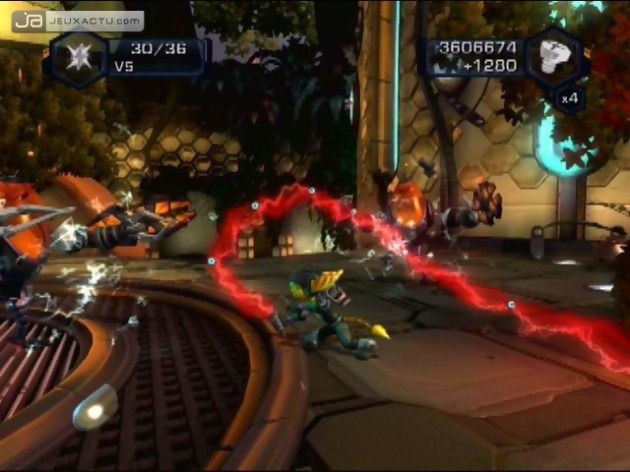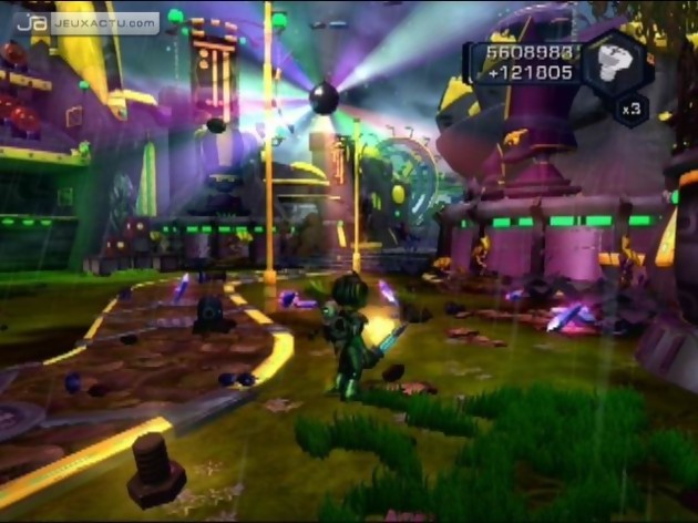 Car c'est bien dans ce domaine que la série a toujours brillé, et brille encore. On commence avec quelques armes de base, mais l'intérêt, c'est d'en acheter de nouvelles régulièrement grâce aux boulons que vous récoltez en tuant les ennemis et en détruisant pas mal d'éléments du décor. Et là, Insomniac s'est lâché. Bah oui, marre des mitrailleuses, des fusils, des guns vus, revus et archi revus ! Ici, on retourne aux sources du jeu vidéo : le fun, le délire, l'imagination. Alors préparez-vous à lancer des tornades contrôlables avec le Sixaxis, à demander de l'aide à un petit robot, à projeter des disques tranchants, à lancer des boules à facette pour faire danser vos adversaires, à les transformer en pingouin, à leur envoyer des centaines d'abeilles tueuses... Et bien sûr, en plus de tout ça, on a quand même des engins plus classiques mais qui font toujours dans la démesure avec des missiles ultra puissants, des tirs multiples etc. La plupart des armes sont même upgradables, et ce de deux façons. La première consiste simplement à les utiliser : plus on s'en sert, plus elles gagnent en expérience, franchissent des niveaux et donc gagnent en puissance. Une fois le cinquième et dernier niveau atteint, on a même droit à une petite fonction supplémentaire. La deuxième méthode est plus classique : vous pouvez dépenser le raritanium que vous amassez (comme les boulons, mais c'est beaucoup moins abondant) pour acheter diverses améliorations. Autant dire qu'au final, on dispose d'un sacré choix ! Et si on peut finir le jeu en jouant les radins et en achetant le moins possible, on a quand même tout intérêt à se faciliter la vie en agrandissant régulièrement sa collection. Si bien qu'avec une talle palette, deux joueurs n'auront pas le même équipement : à chacun de trouver les engins qui lui font plaisir et qu'il estime être le plus efficaces. Et rassurez-vous, si vous êtes du genre à vouloir tout essayer, une fois l'aventure terminée, vous pouvez recommencer en conservant tout votre matériel. Le jeu devient alors plus généreux en boulons, et vous pouvez donc acheter ce qu'il vous manquait et même découvrir encore de nouvelles armes. A noter que les boulons vous permettent aussi d'acheter des armures rendant Ratchet plus résistant aux attaques ennemies.