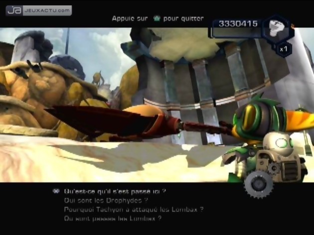Car autant vous le dire de suite, une fois la manette en mains, vous ne la lâcherez pas avant d'avoir vu la fin, ou alors vous ne la poserez que le temps d'une pause pipi, parce que parfois, ça s'impose. Mais les développeurs ont su nous offrir une aventure prenante de bout en bout. Pas tant par son scénario (on sauve la galaxie des griffes d'un tyran ridicule et de petite taille) que par son rythme infernal. Et oui, bonne nouvelle, la série conserve sa qualité principale : elle mêle à la perfection action et plates-formes. On va de planètes en planètes sur lesquelles de nombreux obstacles vous barrent la route. Il faut donc rider des rails, sauter de plate-forme en plate-forme, utiliser un grappin, planer et voler grâce à Clank qui vous sert de sac à dos multifonctions... On contrôle d'ailleurs ce dernier lors de quelques séquences dans lesquelles vous pouvez donner des ordres à des petites créatures très serviables. Mais le coeur de la série reste assurémment les combats contre les ennemis, nombreux, très nombreux. Qui a dit que sauver la galaxie était de tout repos ? Les sbires du big boss peuplent tous les lieux que vous visiterez, plus ou moins gros (ça va du petit robot minable au dinosaure ronchon, par exemple) et plus ou moins armés. Ratchet a beau avoir une bonne droite, il a bien besoin d'un arsenal conséquent pour s'en défaire.