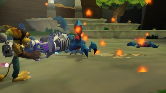 S’il est vrai que le début de le scénario flaire le déjà-vu à plein nez, l’histoire de Ratchet & Clank : La taille, ça compte réussit un contre-pied parfait au bout de quelques minutes de narration. Enfin presque, car si nos deux joyeux lurons profitent d’un peu de calme pour se dorer les fesses au soleil, leur séjour balnéaire est aussitôt interrompu par les appels en détresse d’une fillette, qui se révèle par la suite être une acolyte du méchant de service, aux intentions toujours maléfiques. Voilà comment nos deux lascars se retrouvent engrainés dans une sombre histoire qui va les emmener de planète en planète pour déjouer les plans de ce vil personnage. Ratchet & Clank : La taille, ça compte ne change pas la formule originale et le joueur se retrouvera aux commandes du tandem, lié l’un à l’autre comme les cinq doigts d’une main. Clank bien calé dans le dos de Ratchet permet à ce dernier d’acquérir quelques aptitudes intéressantes. En effet, il pourra profiter des hélices de son compagnon mécanique pour planer un court instant ou réaliser des bonds vertigineux. En plus de sa clef à molettes qui permet de fracasser la tête des ennemis alentours, Ratchet dispose d’un arsenal à faire peur un George Bush. On démarre avec un simple gun mais très vite, en glanant des boulons ici et là, il est possible de s’acheter de nouvelles armes, plus puissantes bien évidemment mais surtout aux caractéristiques différentes. A l’instar d’un RPG, plus Ratchet utilise ses outils et ses armes à feu et plus leur niveau de puissance augmentera. Mieux vaut d’ailleurs frapper un maximum d’ennemis afin de gagner en compétence et en expérience, car les Boss sont, au fil de l’aventure, de plus en plus coriaces.
