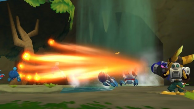 S’il est vrai que le début de le scénario flaire le déjà-vu à plein nez, l’histoire de Ratchet & Clank : La taille, ça compte réussit un contre-pied parfait au bout de quelques minutes de narration. Enfin presque, car si nos deux joyeux lurons profitent d’un peu de calme pour se dorer les fesses au soleil, leur séjour balnéaire est aussitôt interrompu par les appels en détresse d’une fillette, qui se révèle par la suite être une acolyte du méchant de service, aux intentions toujours maléfiques. Voilà comment nos deux lascars se retrouvent engrainés dans une sombre histoire qui va les emmener de planète en planète pour déjouer les plans de ce vil personnage. Ratchet & Clank : La taille, ça compte ne change pas la formule originale et le joueur se retrouvera aux commandes du tandem, lié l’un à l’autre comme les cinq doigts d’une main. Clank bien calé dans le dos de Ratchet permet à ce dernier d’acquérir quelques aptitudes intéressantes. En effet, il pourra profiter des hélices de son compagnon mécanique pour planer un court instant ou réaliser des bonds vertigineux. En plus de sa clef à molettes qui permet de fracasser la tête des ennemis alentours, Ratchet dispose d’un arsenal à faire peur un George Bush. On démarre avec un simple gun mais très vite, en glanant des boulons ici et là, il est possible de s’acheter de nouvelles armes, plus puissantes bien évidemment mais surtout aux caractéristiques différentes. A l’instar d’un RPG, plus Ratchet utilise ses outils et ses armes à feu et plus leur niveau de puissance augmentera. Mieux vaut d’ailleurs frapper un maximum d’ennemis afin de gagner en compétence et en expérience, car les Boss sont, au fil de l’aventure, de plus en plus coriaces.