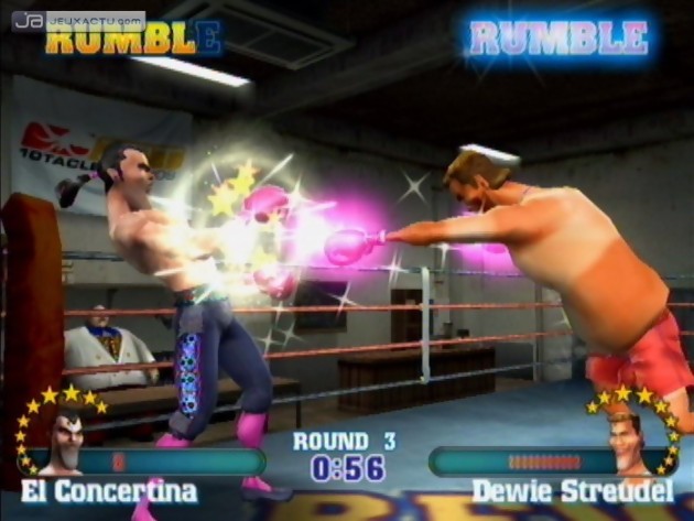Pour relever le challenge, AKI Corporation a décidé de choisir la Wii comme support de prédilection. Avec son bagout actuel et surtout sa forte popularité auprès d’une certaine tranche d’âge de joueurs, la dame blanche de Nintendo semble le support parfait pour faire la une des journaux. Et puis, avec l’aide du succès de Wii Sports et sa démo de boxe, tout semble concorder pour que le public réponde à nouveau présent. Evidemment, pour ne pas dénaturer le concept d’origine, les concepteurs ont pris la sage décision de repiquer les ingrédients des précédents épisodes, à commencer par proposer une liste de boxeurs aussi loufoques que déjantés. Il y a en a 18 au total et chacun d’entre eux représente plus ou moins une caricature d’une personnalité du showbiz. Kaizer Kong et son regard froid fait immédiatement penser à Arnold Schwarzenegger tandis que Dewie Streudel ne cache pas ses liens de parenté avec un certain David Hasselhoff. L’humour dans Ready 2 Rumble Revolution est donc omniprésent, ce qui ne déplaira certainement pas aux fans de la première heure.