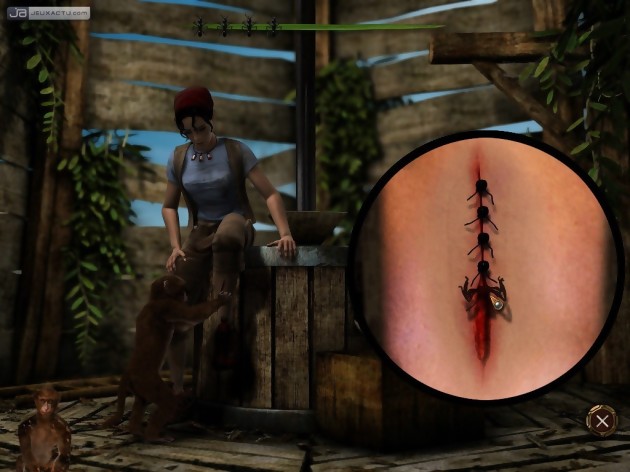 Avant de commencer l'aventure, le jeu nous propose de visionner un résumé très succinct de l'épisode précédent. Une idée simple, voire élémentaire, sur laquelle beaucoup de suites font étrangement l'impasse. Ici, les nouveaux venus ne sont pas laissés pour compte et se voient brièvement présentés Mina, la jeune navigatrice échouée sur l'île mystérieuse, Jep, le singe qu'elle a recueilli, ainsi que les évènements ayant abouti à la découverte du Nautilus du Capitaine Nemo et à la désactivation du bouclier magnétique qui protégeait l'endroit des regards indiscrets. Ce second volet commence donc par l'arrivée d'un hélicoptère de secours, qui embarque Mina et Jep à son bord. Mais frappé par une bombe volcanique, l'engin se crashe au fond d'un lac laissant le pilote pour mort et la jeune fille évanouie. Cette péripétie permet d'appréhender immédiatement la principale nouveauté du titre : Jep est désormais un personnage réellement jouable et plus seulement un "outil" utilisable par Mina. Il peut donc se déplacer à sa guise, interagir avec le décor et même utiliser les objets de l'inventaire. Le réalisme en prend un coup puisque le primate se retrouve à transporter des vases, un jerricane d'essence, un fusil hors d'usage et des dizaines d'autres d'objets dans un sac ou des poches sans fond qu'il n'a même pas ! Une concession à la logique qui n'a finalement guère d'importance face aux avantages qu'elle procure. Le singe peut grimper à des endroits inaccessibles pour l'héroïne, la soigner quand le besoin s'en fait sentir et, surtout, communiquer avec ses congénères poilus. Lorsqu'il se retrouve face à un autre singe, Jep a accès à une palette de comportements (épouiller, intimider, amadouer, offrir, quémander...) qui influent directement sur l'humeur de son interlocuteur.
