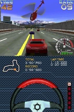 Ridge Racer DS propose 3 types de gameplay axés résolument sur les dérapages. Le premier, appelé Easy, offre une maniabilité des plus classiques mais sûrement la plus confortable. La croix multidirectionnelle permettra de contrôler son engin tandis que les boutons A et B serviront à accélérer et freiner. Les pilotes chevronnés pourront également opter pour une transmission des vitesses manuelle à l’aide des touches X et Y. Une fois le jeu en main et la technique des dérapages maîtrisée, on s’essaye aux deux autres paramètres de contrôle. Le Mode Hard correspond à l’utilisation du stylet pour les gauchers comme pour les droitiers. Dans les deux cas de figure, les gaz, les freins et les rapports de vitesse basculent soit sur la croix multidirectionnelle, soit sur les quatre boutons A, B, X, Y. Dès les premiers tours de circuits, on n’est pas à l’aise armé de son stylet. On a tendance à regarder l’écran du bas affichant le volant plutôt de se concentrer sur la course se déroulant sur l’écran supérieur de la DS. Cette sensation est également présente en Mode Expert avec l’utilisation de la partie tactile de la dragonne. Une mauvaise prise en main de la console vous obligera plusieurs fois durant la course à repositionner votre pouce, perdant pendant le contrôle de votre véhicule une fraction de seconde. Si cela n’a pas de répercutions en ligne droite, imaginez le résultat pendant un virage ou lorsque vous devez redresser votre bagnole. Malgré les tentatives, on reviendra à cette bonne vieille maniabilité croix et boutons, ce qui prouve une fois de plus que l’utilisation tactile de la Nintendo DS est encore perfectible pour un jeu de bagnoles.