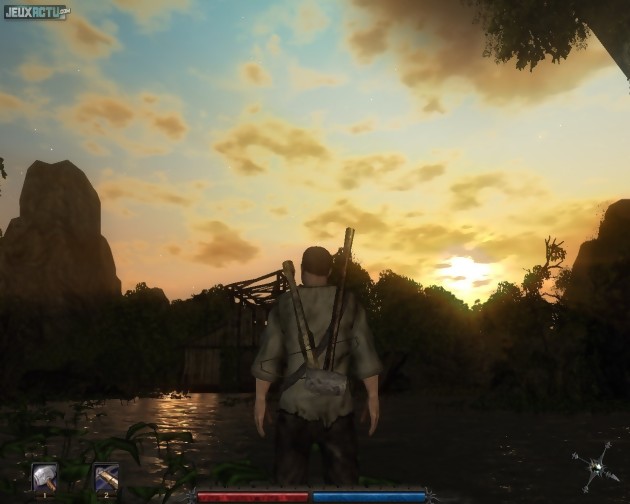 Le héros de Risen commence son aventure en tant que passager clandestin d'un navire bien mal en point, puisqu'en proie à une violente tempête et placé face à un monstre gigantesque. Une scène cinématique et un naufrage plus tard, notre homme régresse carrément au statut de rescapé, avec uniquement des haillons en guise d'armure et une branche ramassée à terre pour se défendre des animaux sauvages alentours. L'île sur laquelle il a échoué n'est donc pas des plus accueillantes, même si elle constitue un paysage très agréable du point de vue du joueur. Car à l'instar des Gothic, et contrairement aux Morrowind et autres Oblivion, les décors ne sont pas générés aléatoirement mais amoureusement placés "à la main". Conséquence immédiate de cette façon de faire : le terrain ne s'étend pas inutilement sur des centaines d'hectares, chaque lieu paraît crédible, des surprises nous attendent au détour de chaque chemin et, en conséquence, les balades à pied constituent un plaisir sans cesse renouvelé. Sans être forcément à la pointe de la technologie, le moteur graphique gère tout de même très correctement les effets de profondeur de champ, de haute luminosité, de végétation touffue, de météo... L'ensemble s'avère plus qu'agréable pour les yeux même si, hélas, on ne peut pas vraiment en dire autant en ce qui concerne les personnages. Si les ogres et les guerriers barbus s'en tirent encore sans trop de dommages, les créatures féminines sont tout simplement ratées. Avec leurs corps anguleux et leurs visages inexpressifs, nous sommes très loin du potentiel de séduction des poupées manga des jeux de rôle japonais, ou des guerrières aguicheuses des MMO occidentaux. Les développeurs de Piranha Bytes souffriraient-ils de misogynie ? Dans ce cas, ils auraient été bien inspirés de ne pas choisir une donzelle nommée Sara comme première rencontre humaine sur l'île. Son physique bancal pourrait, à tort, faire mauvaise impression auprès des joueurs. Mais fi de ces considérations esthétiques ! L'intérêt et la force du jeu se situent vraiment plus sur le fond que sur la forme.