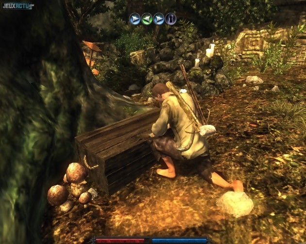 Le héros de Risen commence son aventure en tant que passager clandestin d'un navire bien mal en point, puisqu'en proie à une violente tempête et placé face à un monstre gigantesque. Une scène cinématique et un naufrage plus tard, notre homme régresse carrément au statut de rescapé, avec uniquement des haillons en guise d'armure et une branche ramassée à terre pour se défendre des animaux sauvages alentours. L'île sur laquelle il a échoué n'est donc pas des plus accueillantes, même si elle constitue un paysage très agréable du point de vue du joueur. Car à l'instar des Gothic, et contrairement aux Morrowind et autres Oblivion, les décors ne sont pas générés aléatoirement mais amoureusement placés "à la main". Conséquence immédiate de cette façon de faire : le terrain ne s'étend pas inutilement sur des centaines d'hectares, chaque lieu paraît crédible, des surprises nous attendent au détour de chaque chemin et, en conséquence, les balades à pied constituent un plaisir sans cesse renouvelé. Sans être forcément à la pointe de la technologie, le moteur graphique gère tout de même très correctement les effets de profondeur de champ, de haute luminosité, de végétation touffue, de météo... L'ensemble s'avère plus qu'agréable pour les yeux même si, hélas, on ne peut pas vraiment en dire autant en ce qui concerne les personnages. Si les ogres et les guerriers barbus s'en tirent encore sans trop de dommages, les créatures féminines sont tout simplement ratées. Avec leurs corps anguleux et leurs visages inexpressifs, nous sommes très loin du potentiel de séduction des poupées manga des jeux de rôle japonais, ou des guerrières aguicheuses des MMO occidentaux. Les développeurs de Piranha Bytes souffriraient-ils de misogynie ? Dans ce cas, ils auraient été bien inspirés de ne pas choisir une donzelle nommée Sara comme première rencontre humaine sur l'île. Son physique bancal pourrait, à tort, faire mauvaise impression auprès des joueurs. Mais fi de ces considérations esthétiques ! L'intérêt et la force du jeu se situent vraiment plus sur le fond que sur la forme.