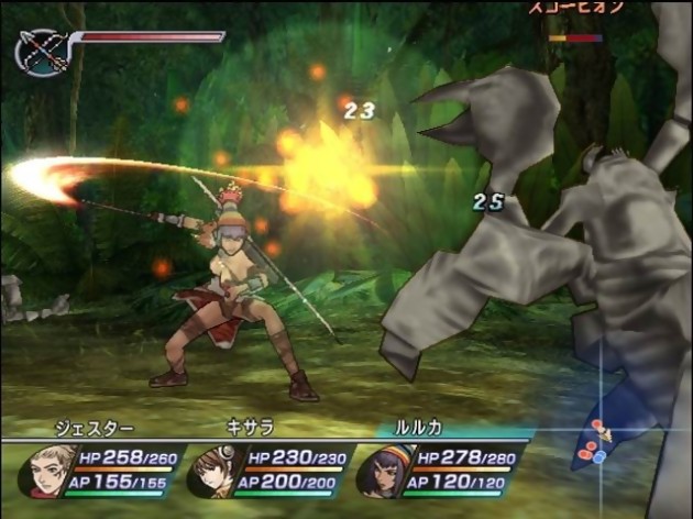 Gros chapitre de tout bon RPG, les combats de Rogue Galaxy tirent d'entrée la production de Sony vers le haut. Imaginez d'abord des déplacements et des actions totalement libres, comme dans un Star Ocean. Ici, le parallèle avec Final Fantasy XII s'éloigne. Ne cherchez pas une main mise sur l'I.A. alliée façon Gambit System, toute customisation abyssale (voire superflue) n'a pas sa place dans ce RPG qui compense avec un ingénieux système de suggestions. Le joueur ne maniant forcément qu'un seul individu à la fois (possibilité de switcher) l'interaction avec ses compatriotes ne se joue que sur très peu de détails, mais ces derniers vont, en fonction de la situation, vous proposer spontanément des solutions qu'il vous suffit de confirmer ou d'infirmer avec les gâchettes. Est-il utile d'utiliser une potion de soin comme le suggère Kisala , ou bien vaut-il mieux en finir tout de suite avec un bon coup spécial comme l'encourage Steve ? Libre à vous de décider. Si l'on peut regretter de ne pas vraiment avoir une influence sur les tendances des suggestions, ce principe ingénieux permet aux personnages commandés par le CPU de jouir d'un certain libre arbitre. Ni trop simplet, ni trop profond, ce petit détail tend à rendre l'équilibre et le rythme de jeu incroyablement bien balancés. Ajoutez à cela une capacité de mouvement très variée : le personnage saute, peut parer une attaque, ou encore choper les adversaires. Sommes nous dans un beat'em all ? Non, une petite restriction anti-bourrin a tout de même été pensée avec la jauge d'action qui, une fois vide, oblige à reprendre son souffle. Mais ce n'est que pour peu de temps, sans oublier que parer un coup avec succès aura pour effet de la remplir fissa ! Aviez-vous déjà vu un RPG dans lequel il faut d'abord sauter sur un ennemi pour pouvoir dévoiler son point faible ? Ce pur RPG qu'est Rogue Galaxy se fait donc hybride avec un Action RPG façon Kingdom Hearts. Si en plus je vous parle de la jauge spéciale qui, lorsqu'elle est pleine, permet de déclencher une sortie de furie basé sur une série de boutons à valider en rythme, nous parviendrons facilement à la même conclusion : le dynamisme est le maître mot des combats de Rogue Galaxy, terme qu'il était plutôt difficile d'employer à propos d'un Final Fantasy XII aux relents offensifs passifs. Et comme pour mettre toutes les chances de son côté, Rogue Galaxy surprend sur de petits détails ergonomiques comme l'utilisation instantanée d'un objet. Le combat est interrompu par l'ouverture du menu, et l'utilisation d'une bonne potion de soin ou de résurrection est immédiate, tant que la jauge d'action permet de piocher l'objet ! L'absence de la stratégie propre au tour par tour provoque t-elle une répétition de l'action ? A vrai dire, Rogue Galaxy n'est pas davantage répétitif, que n'importe quel autre RPG, mais la fréquence des combats est assurément conséquente, et son level design prévu pour que le joueur ait le temps de faire un bon paquet de rencontres. Par ailleurs, il s'agit d'une alchimie globale : le fait de constamment imbriquer des nouveaux objets dans les tableaux de Révélations donne la sensation d'évoluer constamment. On ne se prend également pas la tête au niveau de l'équipement, avec simplement deux armes par personnages (courte et longue distance) à renouveler régulièrement pour évoluer en cohérence avec son level.