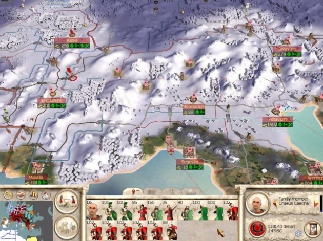 Gérer son empire n’est pas une des choses les plus aisées. Pour ce faire, il existe une autre vue du monde : la carte stratégique. Le temps sur cette carte s’effectue au tour par tour, et l’on se retrouve avec une approche très jeu de plateau (comme Risk). Sur celle-ci, on voit les différentes frontières de note empire, ainsi que l’empire de ses voisins. Les voisins alliés sont nettement visibles (armées et ressources diverses), alors que les voisins neutres ou hostiles sont dissimulés. Pour les repérer, on envoie une armée ou, pour plus de finesse, on peut envoyer des émissaires ou des espions. Les espions ne doivent évidement pas se faire repérer alors que les émissaires opèrent au grand jour. Mais un émissaire peut bien entendu se faire capturer ou tuer. Quand on capture un territoire, on peut et doit le faire prospérer. Première chose à faire, la population ne vous aime pas. Vous pouvez alors choisir de l’exterminer ou bien essayer la manière douce en la charmant. Attention, un peuple mécontent peut bien entendu se rebeller et l’on a vite fait de perdre une région. Pour éviter cela, évitez les impôts trop élevés (vitaux car ils servent à financer vos constructions et surtout à payer la solde de l’armée), endoctrinez-les par la construction de temples ou encore divertissez-les par des jeux du cirque. Toutes les constructions possibles suivent un arbre technologique riche et varié permettant, à terme, de ramasser plus d’argent et de constituer une armée de plus en plus efficace.
