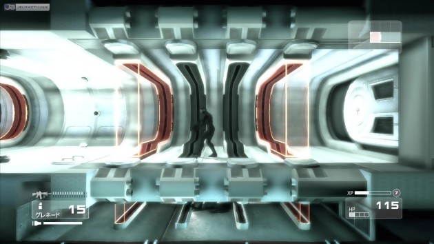 A l'image de ses illustres "prédécesseurs", Shadow Complex est en effet centré sur la collecte de capacités, permettant au héros d'emprunter des voies auparavant inaccessibles, mais souvent parfaitement visibles depuis les premières minutes de jeu. Une recette très accrocheuse fonctionnant sur la frustration, poussant le joueur à revenir sur les lieux de sa découverte dès le sésame acquis. D'autant qu'à l'image de l'équipement s'étoffant au fur et à mesure, vos réserves de grenades, de vie et d'autres composantes essentielles à votre survie progressent également suivant vos recherches. Souvent bien dissimulées, ces améliorations – pas indispensables dans l'absolu – vous demanderont souvent de vous écarter de votre route initiale. Mais plus que de simples items habilement cachés, ces "recharges" sont surtout un excellent moyen de se plonger davantage dans la richesse du level-design. Moins labyrinthique que le château aux deux visages de Symphony of the Night, le complexe militaire du soft de Chair Entertainment permet en revanche d'appréhender une situation de deux manières différentes, notamment grâce à la présence de nombreux conduits d'aération et autres couloirs secrets que vous pourrez détecter grâce à votre lampe-torche. Son faisceau colorant dans une couleur bien précise certains éléments interactifs du décor. Dans les faits, une teinte particulière est directement en rapport avec l'une des vos armes. Par exemple, les plaques vertes nécessitent l'utilisation d'une grenade, tandis que les mécanismes violets vous demanderont de recourir aux munitions à mousse. Une idée très pratique, retirant l'aspect méticuleux d'un Super Metroid dans lequel le jouer devait fouiller le moindre recoin à l'aide de ses petites bombes sans indice, mais permettant au titre de rester plus accessible sans pour autant sacrifier l'excitation de l'exploration. Autre évolution dans le concept de base, il est possible de choisir deux types d'attaques face à l'ennemi, à savoir la méthode frontale en surgissant arme au poing dans le tas ou la manière plus douce de l'infiltration agrémentée de neutralisations en silence. Si cette distinction opère pendant la "première" partie du jeu, surtout à cause d'une I.A. ridicule rejoignant celle des gardes de Metal Gear Solid premier du nom, elle fonctionne bien moins une fois Jason équipé de plusieurs pièces d'armure. En effet, plus résistant, plus puissant mais pas vraiment plus discret, le héros devient une sorte de surhomme que rien n'arrête laissant malheureusement de côté l'aspect infiltration qui aurait pourtant pu donner davantage de poids à Shadow Complex. Il faut croire que les Américains ne résistent jamais longtemps à la mitraillette.