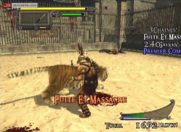 Ces armes bonus sont accessibles quand le compteur de salves (les applaudissements de la foule) atteint une valeur critique. Vous pouvez alors prendre une pose et vous faire acclamer par la foule pour devenir leur champion. Pour vous récompenser, on vous jettera une arme titanesque : épée géante, hallebarde gargantuesque, trident digne de Neptune… Bref, c’est le maxi carnage assuré dans les rangs de vos opposants. Méfiez-vous d’ailleurs de ces derniers qui, non contents de vous être toujours supérieur en nombre, n’hésitent pas à piquer les armes présentes sur le terrain pour s’en servir (eux aussi abîment leur matériel). Dans le registre des objets présents sur le "ring", on trouvera de temps à autre des protections type casque ou de la nourriture pour remonter un peu le niveau de sa barre de vie. Une des astuces du jeu consiste d’ailleurs à se faire acclamer par la foule, même si la barre de salve n’est pas à son apogée, pour obtenir de la nourriture et remonter sa fragile barre de vie. Toujours dans les astuces de combat, il ne faut pas hésiter à achever ses adversaires au sol, à se déplacer dans leur dos, à sortir un combo meurtrier sur un ou plusieurs opposants ou à en projeter un autre sur des pics pour faire monter la jauge de salves et récupérer une arme bénie. Et avec cette arme, les salves montent encore plus vite…La boucle est bouclée, toujours plus de frénésie, toujours plus de combos, toujours plus de sang…
