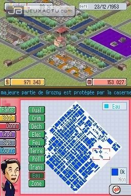 Pour rendre cet élégant produit de la culture "sim" californienne un peu plus accessible aux plus jeunes et au marché nippon, les chargés de cette conversion ont eu la très mauvaise idée de la japoniaiser un peu. Si les consommateurs de l’archipel ont largement récompensé cet effort, ce choix éditorial laisse l’acheteur occidental totalement dubitatif. Première hérésie, vous êtes désormais assisté dans toutes vos taches par un insupportable conseiller au look SD (en gros, une tête énorme sur un corps minuscule), qui vous invite à rencontrer, par le biais de non moins odieux écrans de blabla, des citoyens lambdas typiquement nippons. De l’otaku inquiétant obsédé par les trains à la lycéenne brûlée par les UV, c’est tout un petit monde sorti de l’univers manga qui vient quémander, qui de nouvelles gares, qui un zoo. Ces interventions, censées vous indiquer les principaux défauts de votre ville et les moyens d’y remédier, tapent vite sur le système. Elles s’avèrent surtout bien moins utiles que les bons vieux graphiques, tableaux, éditions du journal local, bref, que tous les outils qui vous permettaient de mieux comprendre les attentes de votre communauté sur les versions PC. Simplifié, voire mutilé, ce Sim City DS se fourvoie sur la voie d’une accessibilité qu’il n’atteint jamais. En effet, passé un certain cap, il est difficile de comprendre comment entretenir la croissance de sa cité, qui se déploie sur des cartes finalement bien petites. Les quelques statistiques disponibles sont parfois obscures et systématiquement incomplètes, et des données qui pourraient être utiles ne sont tout simplement pas intégrées. Combien d’étudiants font semblant d’apprendre dans ces universités qui vous coûtent si cher ? Combien de voyageurs empruntent ces bus que vous mettez en place en positionnant des gares routières aux grandes intersections ? Impossible d’avoir des réponses à ces questions pourtant essentielles. Et si vous finissez par percevoir les principaux défauts de votre stratégie de développement, bon courage pour les corriger. Pas franchement maniable, la grille qui vous sert de plan de travail étant découpée en carrés très petits et malaisés à sélectionner au stylet, Sim City DS est également peu lisible. Les bâtiments sont difficiles à identifier de loin, et s’il est possible de zoomer, le scrolling très laborieux ne vous permet pas d’explorer toute la carte en vue rapprochée. Faute de parfaitement exploiter le dual screen, cette conversion tente tout de même d’offrir quelques quelques mini-jeux "tactiles", qui se révèlent totalement vains. Se résumant essentiellement à des phases de clic frénétique – sur un Père Noël survolant votre ville le soir du 24 décembre ; sur des feux d’artifice refusant d’exploser – ces courtes séquences aussi futiles que redondantes agacent plus qu’elles ne distraient. Les quelques scénarios bonus qui viennent compléter le mode de jeu libre et les vagues options multijoueurs pimenteront peut-être un peu le quotidien des affamés de gestion. Mais, sans être une pure catastrophe ludique, ce Sim City DS tronqué ne manque pas de laisser un goût amer à tous ceux qui ont joué à l’une des nombeuses versions de ce mythe du jeu vidéo.