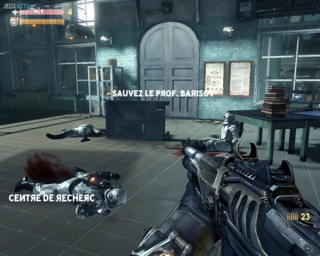Ce genre d'interactions est hélas limité aux objets ayant été marqués à l'E99 (comprenez : aux objets choisis par avance par les développeurs), et ils ne sont pas bien nombreux. En revanche, on n'hésitera pas à faire usage du MT sur un maximum de soldats, qui vieillissent alors instantanément et se retrouvent transformés en squelettes bien inoffensifs. En ajoutant à cela un arsenal plutôt bien fourni et améliorable sur plusieurs niveaux (dégâts de chaque arme, capacités du chargeur, vitesse de rechargement), on obtient de multiples manières de se débarrasser des adversaires. De quoi s'amuser très honnêtement, mais hélas pendant peu de temps puisqu'il faut environ sept ou huit heures pour terminer la campagne solo. Un joueur pressé, qui ne prendrait pas la peine d'explorer les lieux et de s'intéresser aux messages audio et vidéo laissés à son attention, pourra même certainement se gâcher son plaisir en cinq petites heures. La version PC souffre par ailleurs d'un bug qu'on espère voir corrigé bientôt : parfois, le chargement de textures ne se fait pas assez rapidement et l'on peut observer des surfaces très peu détaillées. Un problème de l'Unreal Engine 3 déjà aperçu dans Bioshock ou Unreal Tournament III, mais qui ne durait alors qu'une ou deux secondes. Ici, il peut se passer plusieurs minutes pendant lesquelles on évolue dans des décors sérieusement dégradés. Pas de quoi se formaliser outre mesure tout de même, car ce n'est pas systématique et dans le feu de l'action on n'y fait pas toujours attention. Terminons par un mot sur le mode multijoueur, qui oppose une équipe de soldats à une équipe de créatures mutantes. Ces dernières évoluent en vue à la troisième personne, ce qui apporte un peu de renouveau au gameplay. Mais du succès commercial du jeu dépendra l'intérêt de ce mode multi. Sans personne à affronter, à quoi bon guerroyer ?