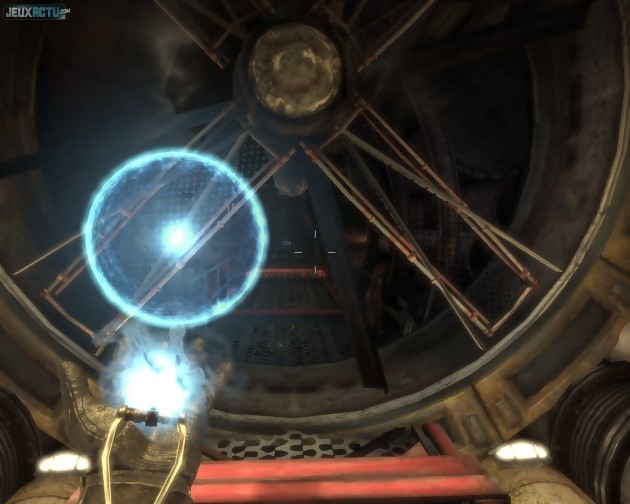 Heureusement, Singularity peut compter sur son manipulateur temporel (MT) pour introduire un peu de piquant dans sa recette. Cet outil, que le héros finit par se greffer au bras gauche, permet différents tours de passe-passe. Une nouvelle fois, il n'y a rien qu'on ait vraiment jamais vu ailleurs, mais l'ensemble des possibilités de ce bijou technologique dopé à l'E99 le rendent très sympathique. Tout d'abord, tel le Gravity Gun de Half-Life 2, il permet de soulever certains objets et de rattraper au vol les plus gros projectiles. Il peut également lancer des sphères de chrono-énergie qui ralentissent le temps, histoire de s'accorder un peu de répit face à une vague importante d'ennemis ou de figer les pales d'un ventilateur géant qui bloque le passage, ou bien encore infliger une violente impulsion énergétique, qui repousse les ennemis au loin. De manière totalement anecdotique, il permet également de ramener en 2010 des objets déphasés en 1955. Cela aurait pu être l'occasion de poser au joueur quelques énigmes bien tordues, mais il n'en est rien. On s'en sert à deux ou trois reprises à des endroits prédéterminés pour attirer à nous une caisse ou un baril explosif, et voilà tout. Plus intéressant, grâce à lui, on peut transformer les soldats en horribles créatures, tellement assoiffées de sang qu'elles n'hésitent pas à se retourner instantanément contre leurs anciens camarades de régiment. Ces différentes capacités sont débloquées au fil de l'aventure, ce qui assure d'une progression permanente dans le gameplay. Mais la première d'entre elles est également la plus importante, et donc celle dont on se sert au final le plus. Il s'agit carrément de la possibilité de vieillir les objets, ou de les ramener à leur état d'origine. On peut s'en servir par exemple pour faire rouiller un cadenas et accéder ainsi à un placard auparavant verrouillé. Même principe pour les portes des coffre-forts, que quelques secondes suffisent à délabrer. A l'inverse, un escalier effondré retrouvera une nouvelle jeunesse et ouvrira un nouveau chemin, tandis que les débris d'une mallette de munitions se transformeront à nouveau en distributeurs de bonus plein à craquer. Ici, c'est un dispositif d'ouverture électronique de porte qu'on rétablira, tandis que là, c'est une armoire électrique qu'on déglinguera afin d'électrocuter les ennemis alentours. Mais la plupart du temps, les énigmes de progression faisant appel au MT se limitent à redonner sa forme initiale à une caisse brisée, afin de pouvoir grimper dessus et atteindre une hauteur autrement inaccessible. Ou bien à la glisser dans sa forme aplatie sous un rideau de fer trop abaissé, avant de lui redonner du volume pour forcer l'ouverture.