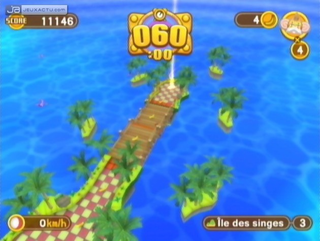 Découpé en 8 mondes différents, répartis en 10 niveaux chacun, la partie solo de Super Monkey Ball : Banana Blitz se distingue essentiellement par la présence de Boss à éliminer en fin de parcours. C’est assez inattendu mais plutôt bien pensé pour conclure avec brio la fin de chacun des chapitres. Cracoucass géant, pieuvre métallique, gorille mécontent, dinosaure mécanique, chacun d’entre eux dispose d’un point faible pas bien difficile à repérer. Assez faciles à abattre, ce ne sont pas ces Boss qui donnent le plus de fil à retordre mais bel et bien les différents parcours qui mènent à eux qui proposent un challenge de taille. Fidèle à sa réputation, Super Monkey Ball : Banana Blitz ne déroge pas à la règle et propose un certain nombre de parcours qu’on s’amusera à répéter à plusieurs reprises avant de pouvoir franchir tranquillement la porte arc-en-ciel, synonyme de réussite. Parmi les petites nouveautés notables, Super Monkey Ball : Banana Blitz introduit de nouveaux singes. Si AiAi, GonGon et MeeMee sont des personnages que l’on commence à connaître sur le bout des doigts, il va falloir accueillir comme il se doit l’arrivée de YanYan, petite femelle avec des couettes et de Doctor, atteint de somnolence chronique.